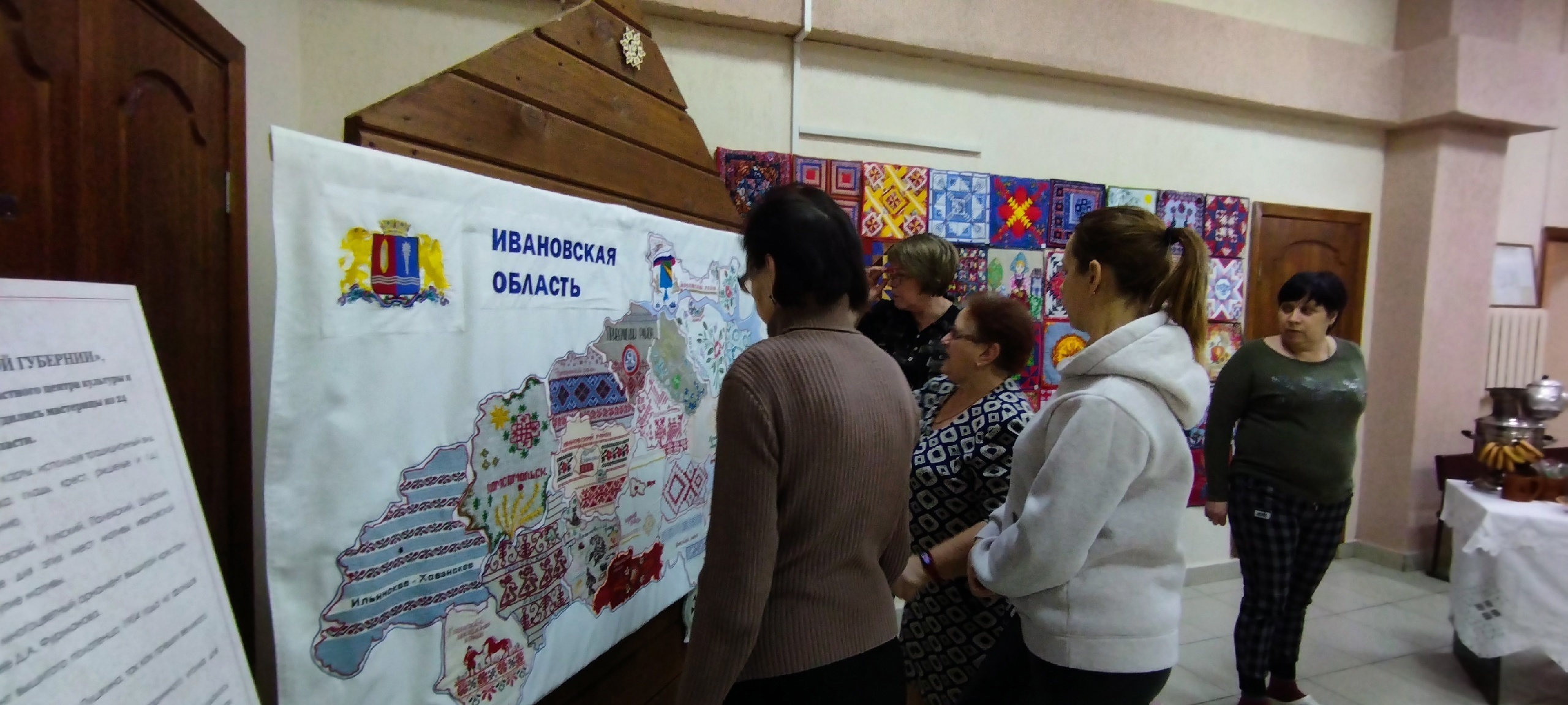 Напомним, на выставке экспонируется вышитая карта Ивановской области, созданная в рамках всероссийской акции «Вышитая Россия» в 2023 году. Карту вышивали 36 мастериц из 21 муниципалитета области. На фрагменте Тейковского района вышит орнамент, традиционный для границы Нижегородской области и Чувашии, так как в советское время в Тейковский район на торфоразработки приезжало много людей из Нижегородской области, Чувашии, Мордовии, и они оставили здесь своё культурное наследие. Работу выполнила жительница посёлка Новое Леушино Елена Саратовская.