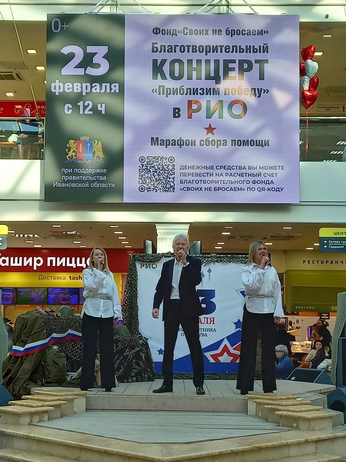 23 февраля в ТЦ «РИО» прошла благотворительная программа «Приблизим Победу» от фонда «Своих не бросаем». В ней приняли участие творческие коллективы г.Иваново. Одним из заметных выступлений программы стал концерт вокальной группы «Звездопад», с военно-патриотическими песнями, большинство из которых написаны ивановскими поэтами и художественным руководителем группы почетным работником культуры Ивановской области А.Булгаковым. В параллель с концертной программой для юных гостей отделом изобразительного и декоративно-прикладного искусства ОКМЦКТ был организован мастер-класс «Подарок папе».