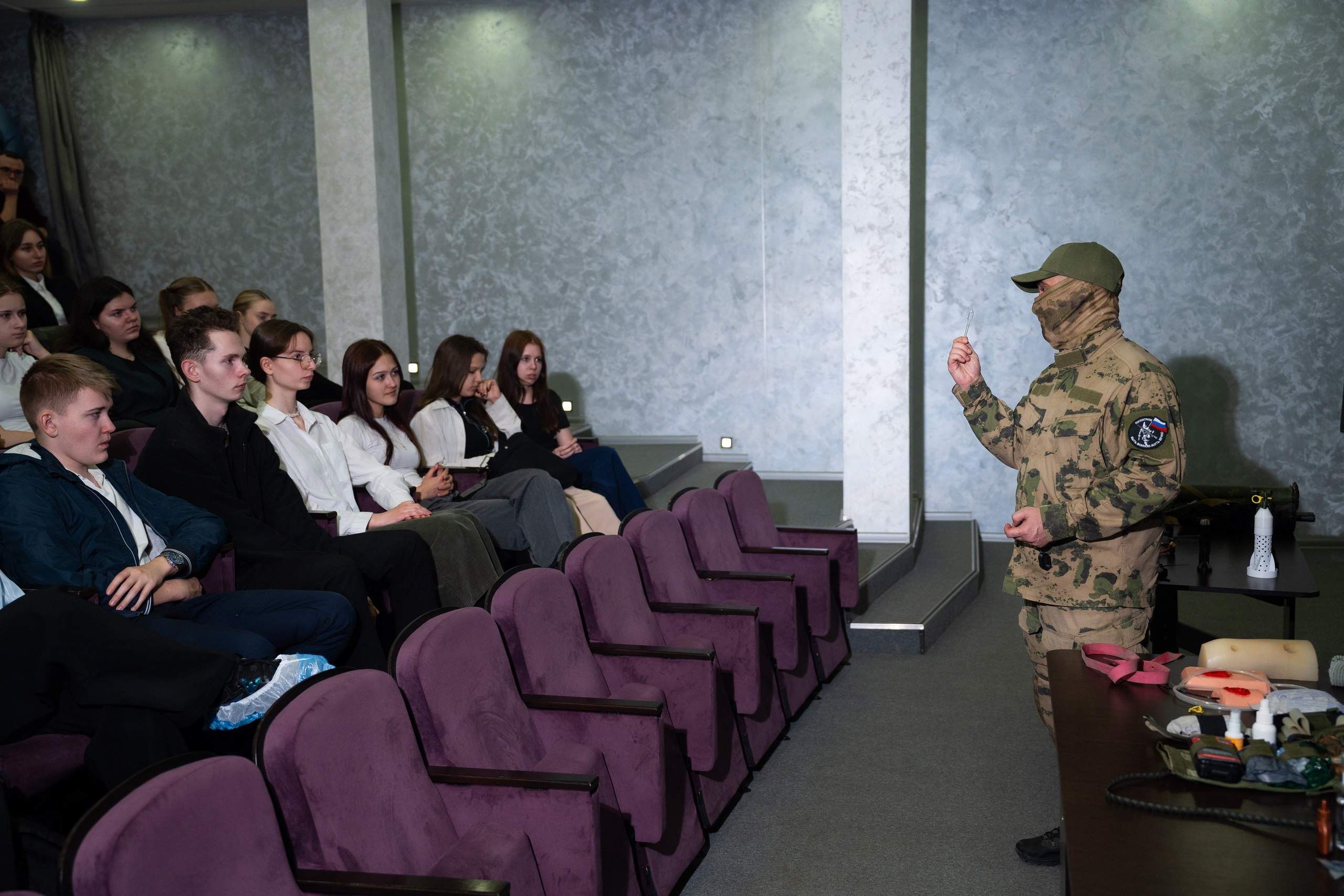 Не менее важной частью урока мужества стали практические занятия по оказанию первой медицинской помощи в экстремальных условиях. Участники клуба наглядно продемонстрировали технику наложения жгута, тампонирования огнестрельных и осколочных ранений, а также способы эвакуации раненых.