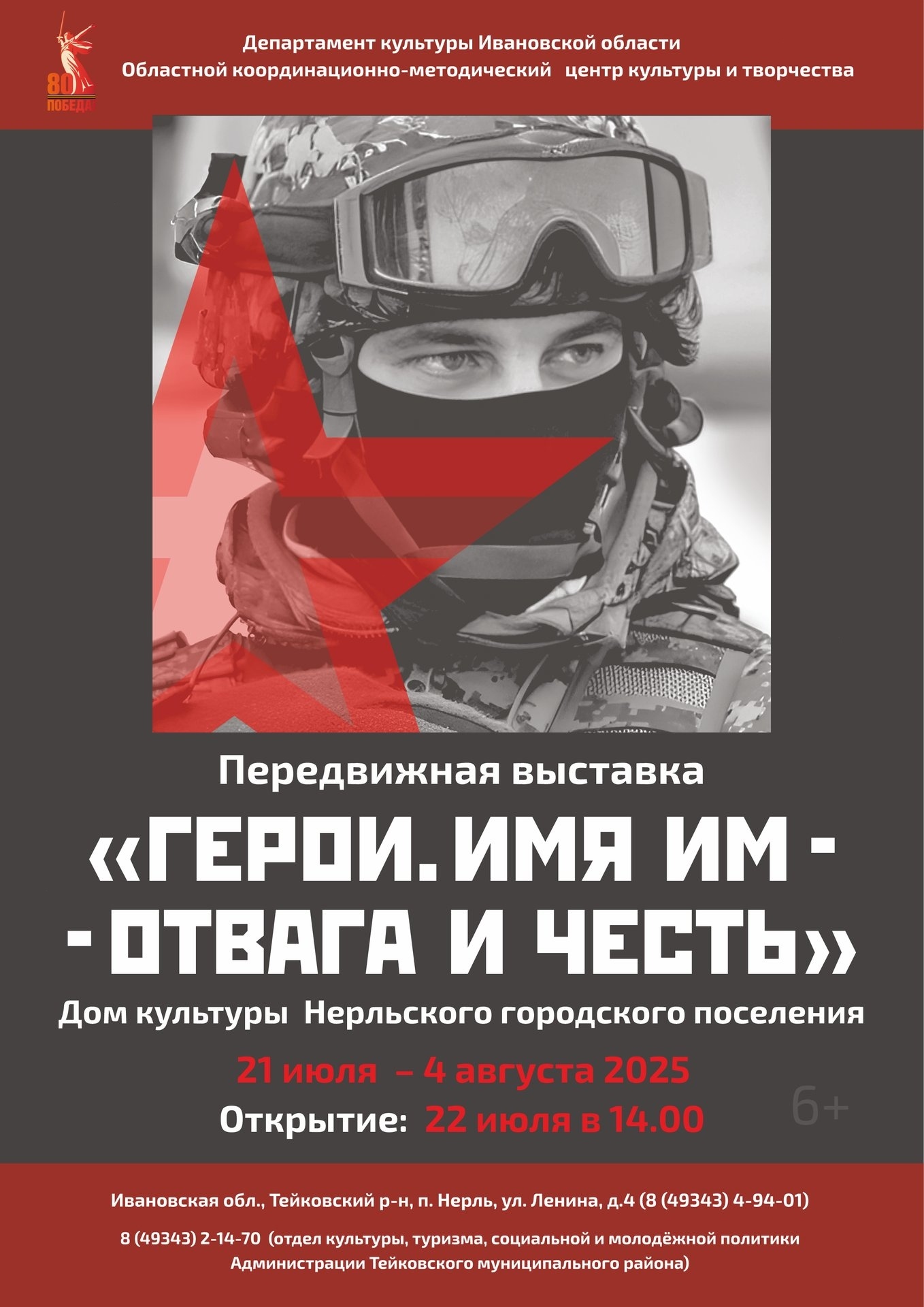 22 июля 2025 г. в Доме культуры Нерльского городского поселения состоится открытие областной передвижной выставки «Герои. Имя им — отвага и честь». Организатор — Областной центр культуры и творчества при поддержке Департамента культуры Ивановской области.