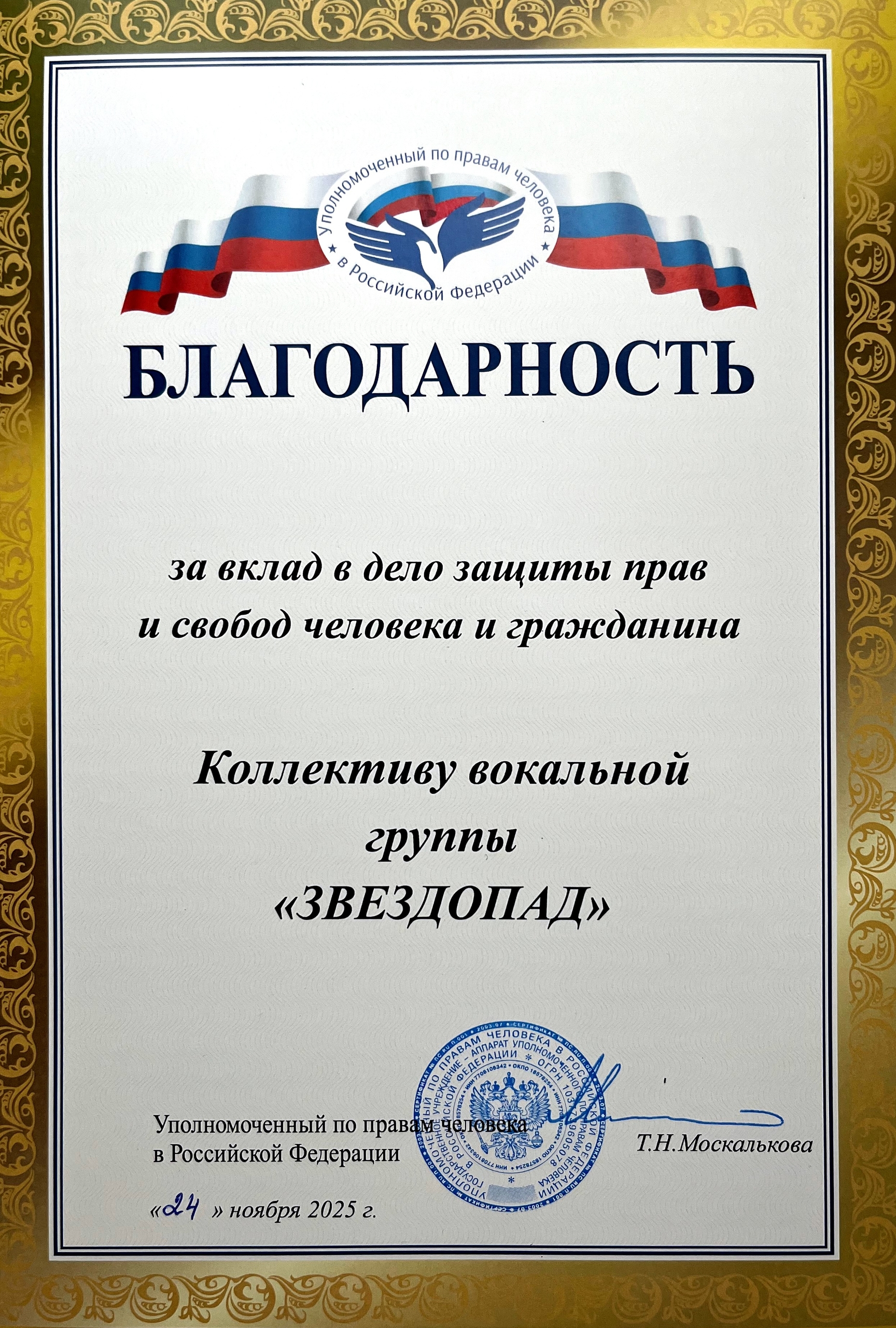 Благодарности Уполномоченного по правам человека в Российской Федерации Татьяны Николаевны Москальковой за вклад в дело защиты прав и свобод человека и гражданина был удостоен вокальный коллектив «Звездопад» Областного координационно-методического центра культуры и творчества (художественный руководитель почетный работник культуры Ивановской области Алексей Булгаков).
