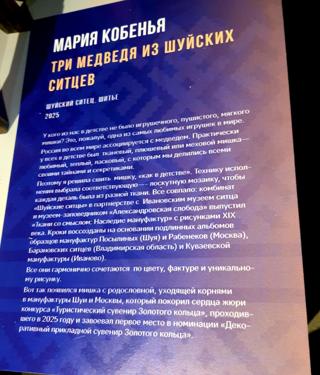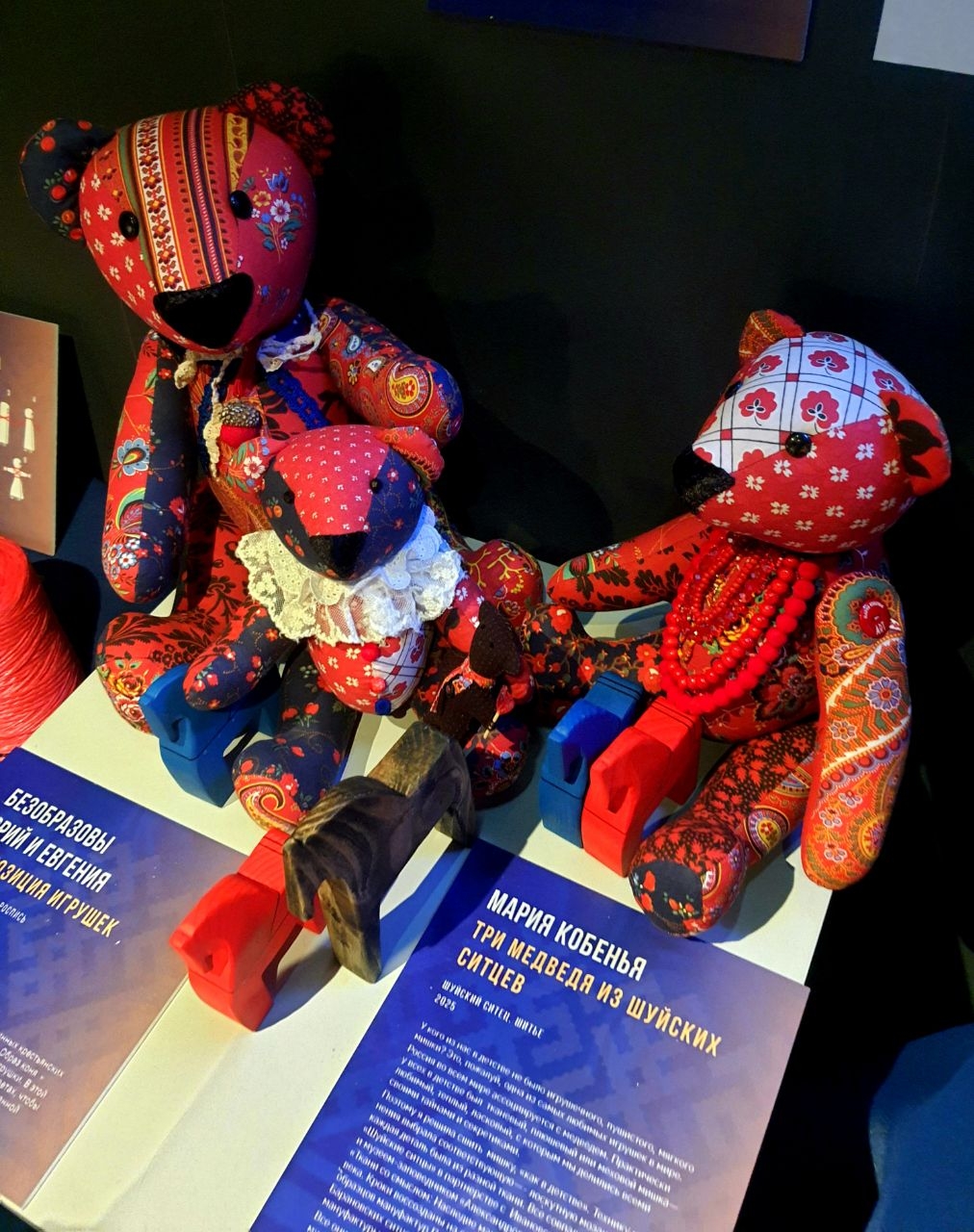 17 декабря в самом центре Москвы, Подземном музее парка «Зарядье» открылась выставка «Русская игрушка: Символ. Образ. Традиция». Две ивановские художницы выставляют там свои работы. Мария Кобенья представила «Трех медведей из Шуйских ситцев», а Ольга Сальникова — домотканое панно «Божественное сияние» и фарфоровые конфетки.