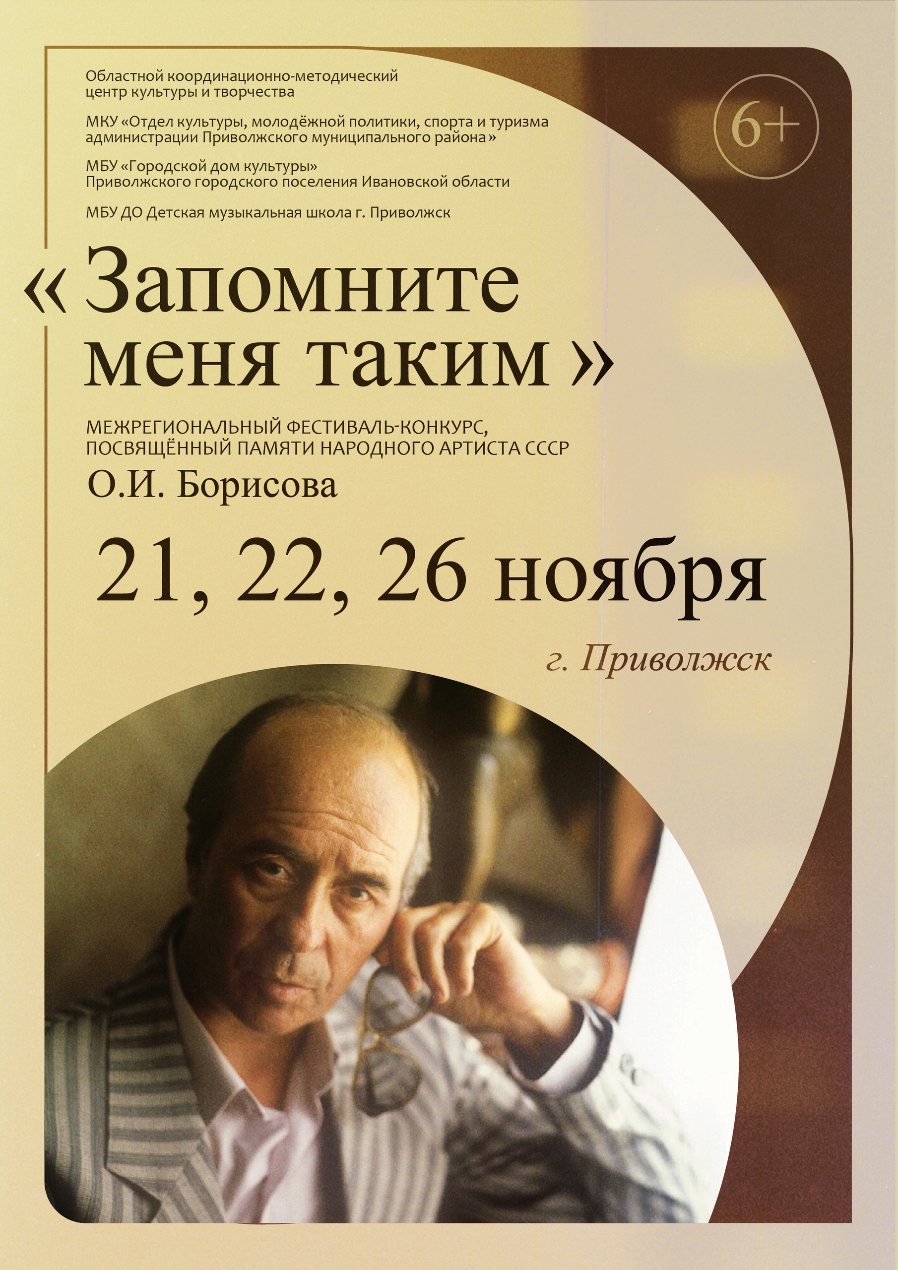 Межрегиональный фестиваль-конкурс «Запомните меня таким», посвящённый памяти народного артиста СССР Олега Борисова, пройдёт в городе Приволжск в конце ноября на двух творческих площадках: Детской музыкальной школы и Городского Дома культуры.