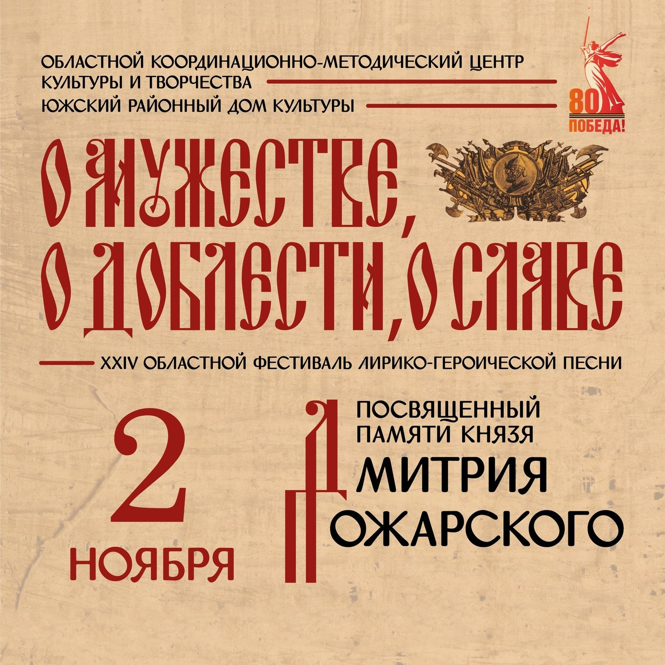 Продолжается прием заявок на участие в XXIV фестивале-конкурсе лирико-героической песни «О мужестве, о доблести, о славе», посвященного памяти князя Д. М. Пожарского. Фестиваль проводится в рамках мероприятий, посвященных Году защитника Отечества и 80-летию Победы в Великой Отечественной войне