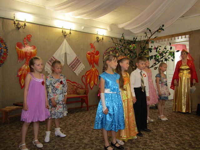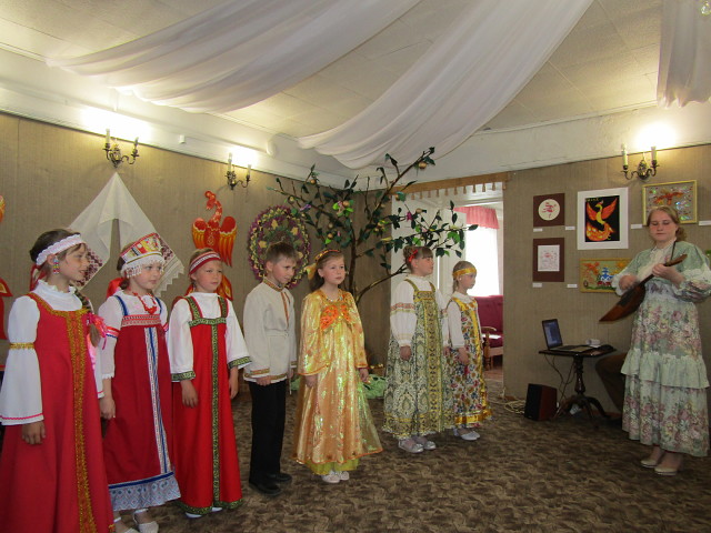 Затем гостей пригласили в нарядную горницу, украшенную работами мастеров Дома ремёсел и их учеников. Здесь их ждала театрализованная концертная программа с выступлением театра мод, театрализованными постановками и музыкальными номерами, посвящёнными сказочной Жар-птице.