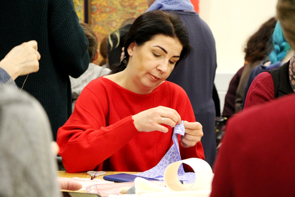 Повойник – старинный головной убор русских замужних крестьянок в виде повязки, надеваемой под платок, стал предметом детального рассмотрения участников семинара. Ю. Блавдзевич не только продемонстрировала мастерицам и студентам, каким образом надевался этот головной убор, но и предложила им самостоятельно изготовить повойник. Под руководством специалиста краеведческого музея участники встречи скроили и наметали изделие, отметив, что несмотря на кажущуюся простоту повойник имеет свои тонкости в изготовлении.