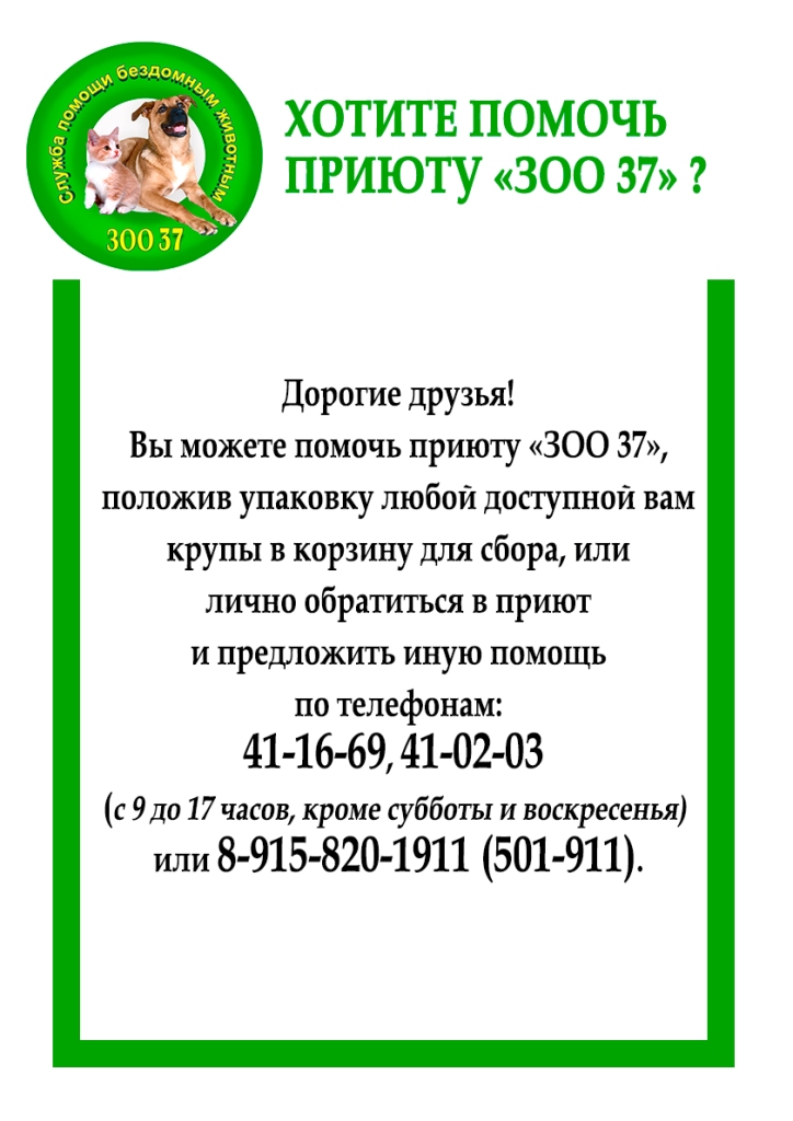 Всех, кто хочет помочь приюту лично, просим обращаться по телефонам: 41-16-69, 41-02-03 (с 9 до 17 часов, кроме субботы и воскресенья) или 8-915-820-1911 (501-911).
