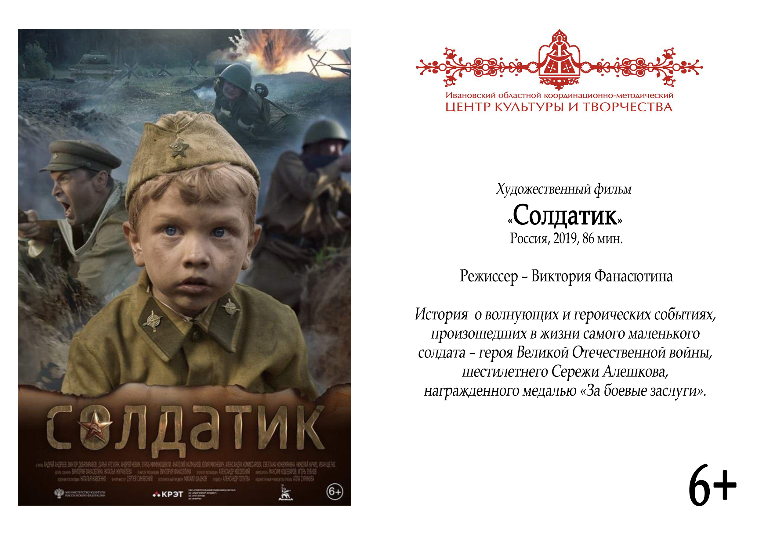 Учащиеся школы также стали первыми зрителями нового художественного фильма «Солдатик». Это трогательная, волнующая история, основанная на реальных событиях, произошедших в жизни самого маленького солдата – героя Великой Отечественной войны шестилетнего Сережи Алешкова. Мальчик потерял всех своих родных, попал в действующую армию и стал настоящим защитником Родины, принимал участие в форсировании Днепра, спас жизнь командиру и благодаря его находчивости были спасены жители целой деревни от взрыва авиабомбы.