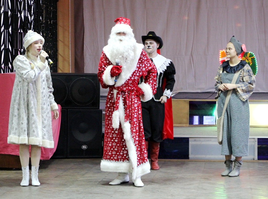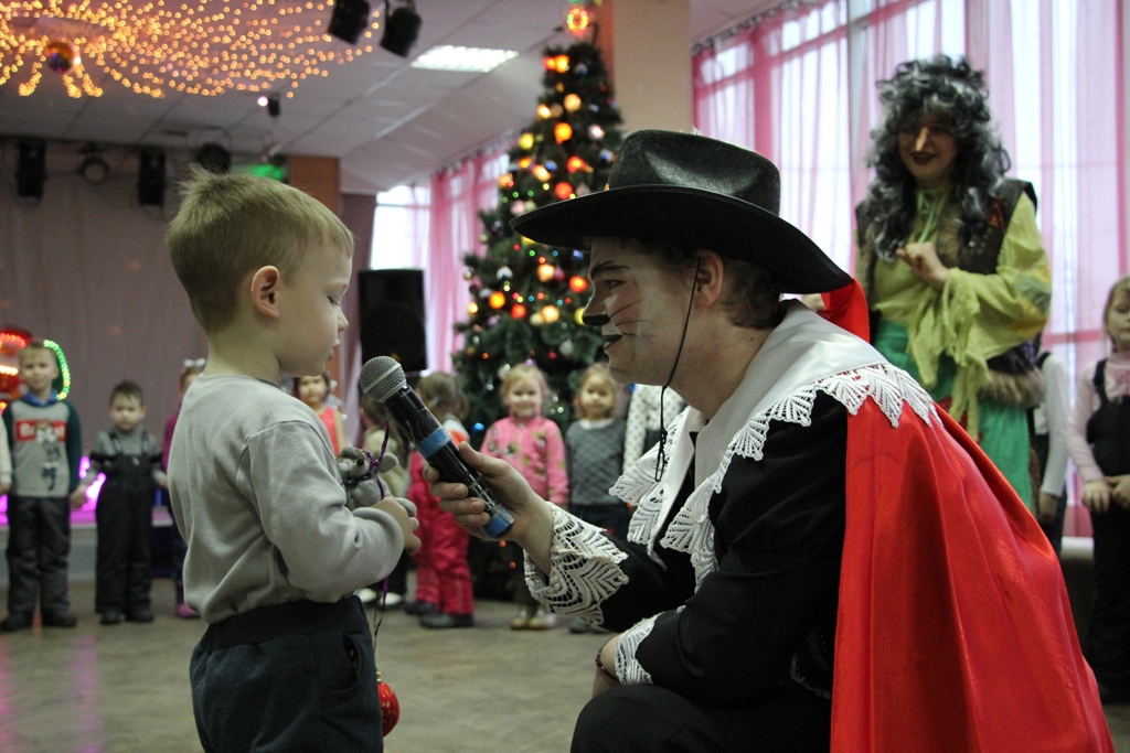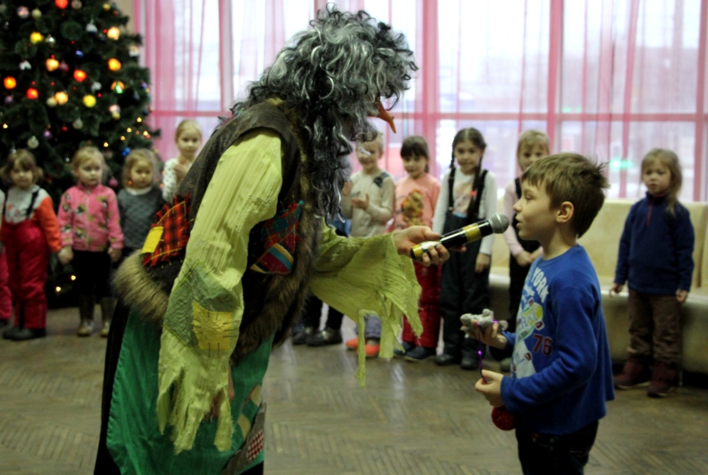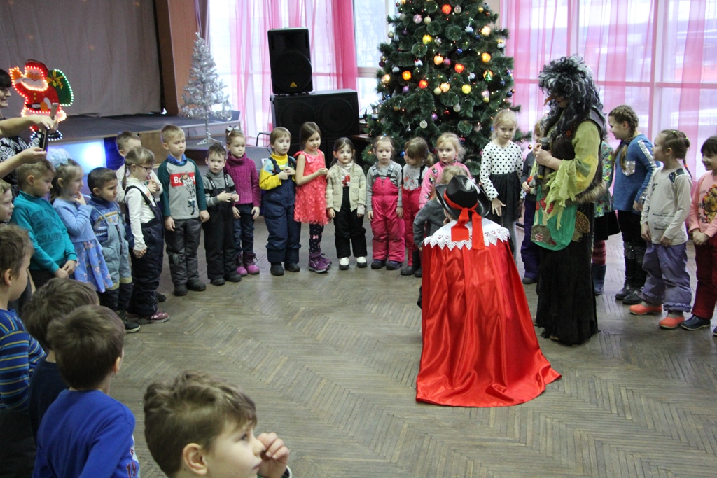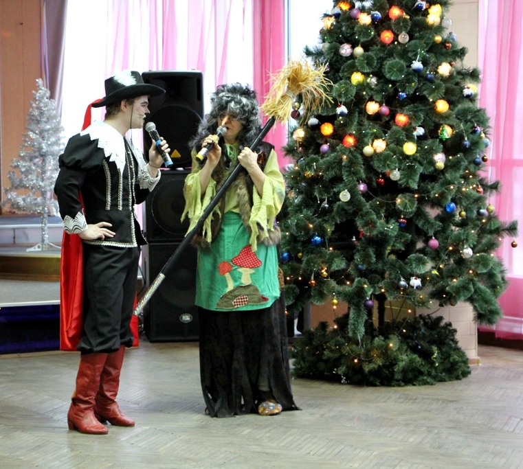 В красивом, по-новогоднему украшенном фойе центра вдруг откуда ни возьмись появилась Баба-Яга на метле, совсем как в сказке. Она начала играть с ребятами, но, притомившись, «свистнула» символ года — Мышку, которая переняла эстафету, продолжив игры с детьми. Но внезапно вынуждена была спрятаться, так как в зале появился Кот в сапогах - ярый противник мышей. Однако с детьми он был ласков и дружелюбен, провел ряд веселых игр. Баба-Яга взяла с Кота слово, что в мышино-крысиный новый год он не будет враждовать с мышами. Герои быстро помирились и продолжили праздник.