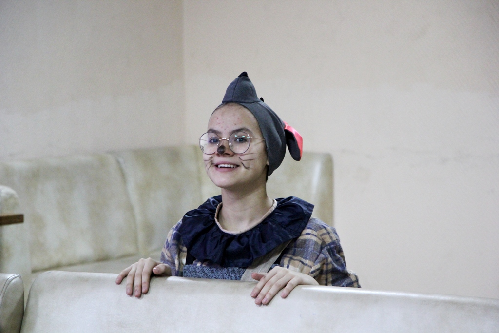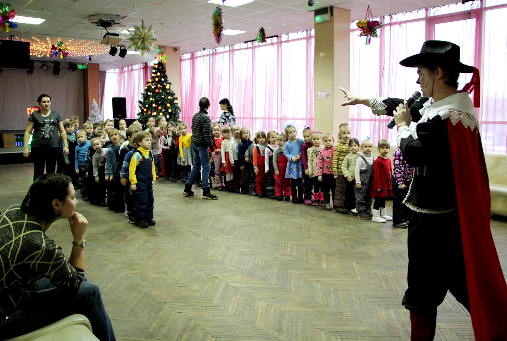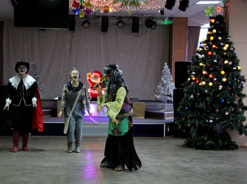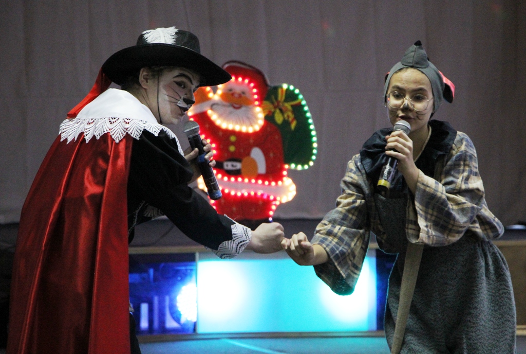 В красивом, по-новогоднему украшенном фойе центра вдруг откуда ни возьмись появилась Баба-Яга на метле, совсем как в сказке. Она начала играть с ребятами, но, притомившись, «свистнула» символ года — Мышку, которая переняла эстафету, продолжив игры с детьми. Но внезапно вынуждена была спрятаться, так как в зале появился Кот в сапогах - ярый противник мышей. Однако с детьми он был ласков и дружелюбен, провел ряд веселых игр. Баба-Яга взяла с Кота слово, что в мышино-крысиный новый год он не будет враждовать с мышами. Герои быстро помирились и продолжили праздник.