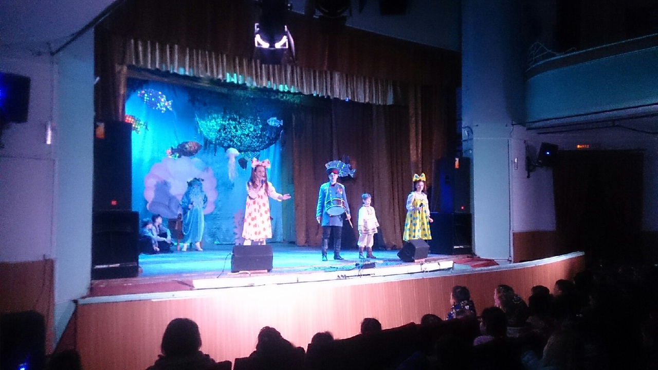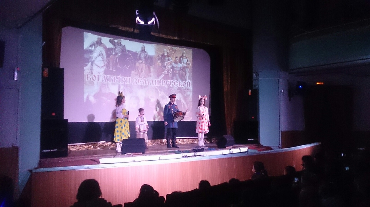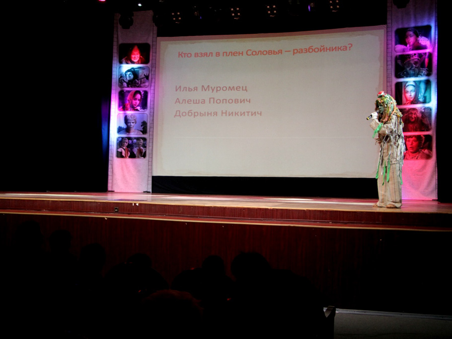 На сцене прошло театрализованное представление «Богатыри земли русской». Главными героями представления были весёлые скоморохи, русский богатырь - бравый солдат, вызвавшийся помочь маленькому Иванушке, спасти его маму - Марью Искусницу, которую похитил царь морской Водяной - Водокрут 13-й. Вместе с героями ребята, пришедшие на праздник, отправились в сказку и попали в подводное царство-государство. Все вместе они смогли победить мокрейшего Водокрута с его пиратами и освободили Марью Искусницу.