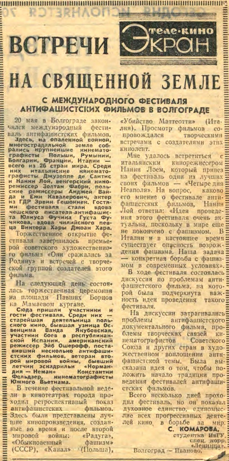 «В мае 1975 года мне, студентке выпускного курса ИвГУ посчастливилось побывать в городе-герое Волгограде на Международном кинофестивале антифашистского фильма специальным корреспондентом ивановской молодежной газеты «Ленинец». Прошло 45 лет, но до сих пор «оживают» в памяти события и встречи этого грандиозного, уникального уже исторического кинофорума, собравшего представителей прогрессивного киноискусства из 30 стран мира. Особенно незабываемым, эмоциональным событием стала премьера фильма «Они сражались за Родину», состоявшаяся в первый день после торжественного открытия кинофестиваля. Фильм представляла большая творческая группа во главе с режиссером Сергеем Бондарчуком. У многих выступающих на глазах были слезы…