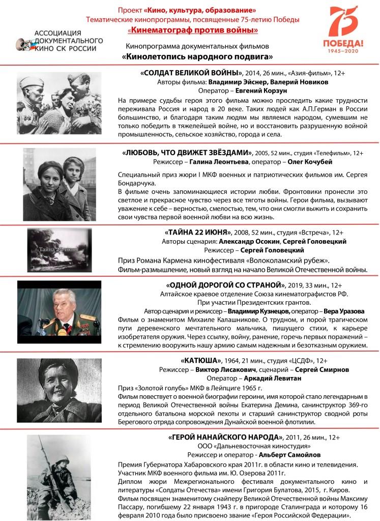 В Год Памяти и Славы, год 75-летия Великой Победы областным центром культуры и творчества в рамках патриотической киноакции «Дорогами Великой Победы» подготовлены тематические кинопрограммы художественных и документальных фильмов. Объединенные общим девизом «Кинематограф против войны», кинопрограммы включают фильмы, созданные в разный период нашей истории. Это и архивное кино, и классика советского кинематографа, кинокартины последних лет, фильмы, созданные с участием кинематографистов-ивановцев и съемки которых проходили в Ивановской области. Особый интерес представляет специально подготовленная программа документальных фильмов от Ассоциации режиссеров документального кино Союза кинематографистов России.