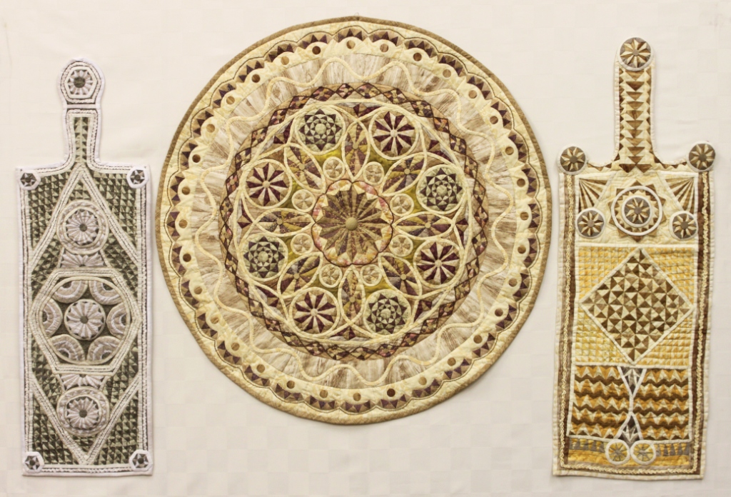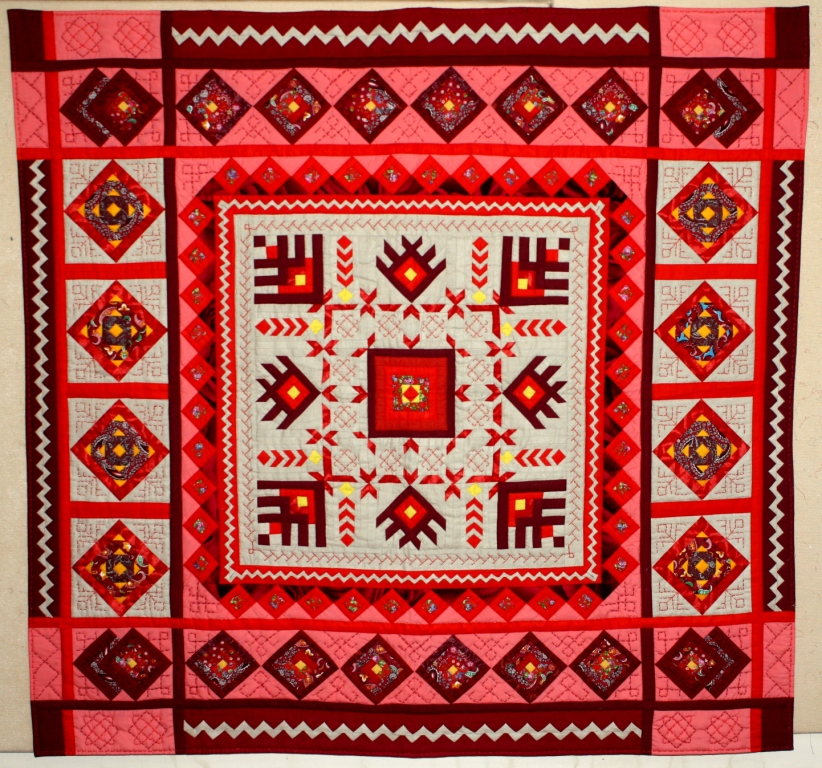Панно «Ладодение» (140х130 см; материалы: х/б ткани, лён; техника: шитье из полос, блок «русский квадрат», орнамент из полос, машинная сборка, декоративная ручная стежка) – коллективная работа творческой группы: Кукушкина З.Н., Гусева Л.В., Кочерова Е.И., Малова Е.И.