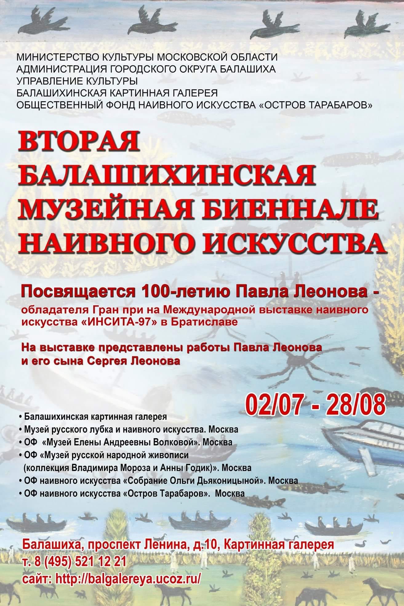 Экспозиция Второй Балашихинской музейной биеннале наивного искусства сложилась из собраний Музея русского лубка и наивного искусства, Балашихинской картинной галереи, Общественных фондов наивного искусства «Собрание Ольги Дьяконицыной», «Остров Тарабаров», «Музей русской народной живописи (собрание Владимира Мороза и Анны Годик)», «Музей Елены Андреевны Волковой», частных собраний. В основе проекта – работы Павла Леонова, созданные им в самые плодотворные годы его творческой жизни – 1990-е.