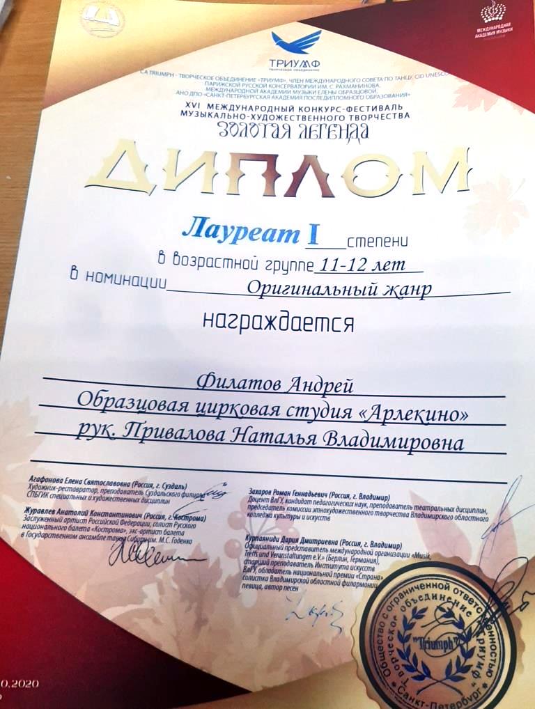 Образцовая цирковая студия "Арлекино" представила на конкурс 5 номеров различных жанров: Андрей Филатов - эквилибр и жонглирование, Жидкова Полина - ручной эквилибр, Соня Денисова - акробатика и "оригинальное трио" - Соня Киреева, Каролина Сажина и Ульяна Печкина.