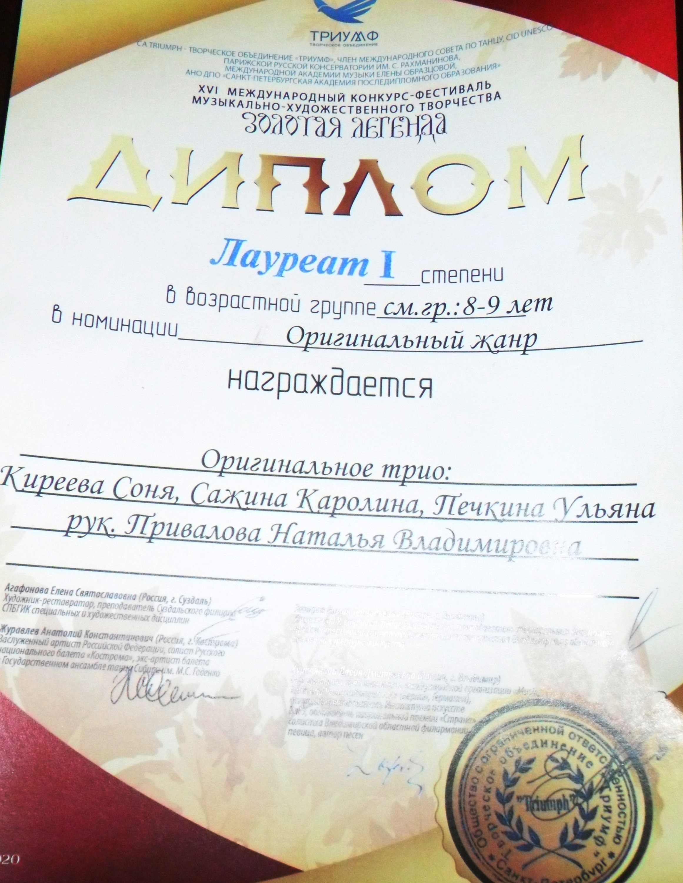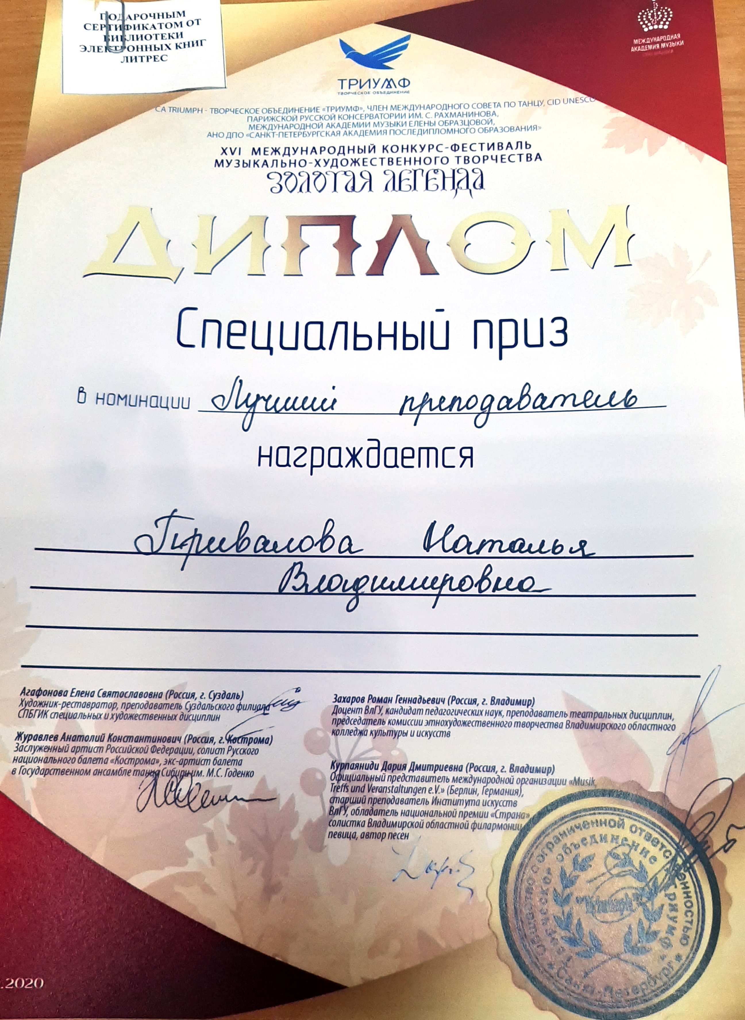Руководитель коллектива Привалова Наталья Владимировна получила специальный диплом "Лучший преподаватель".