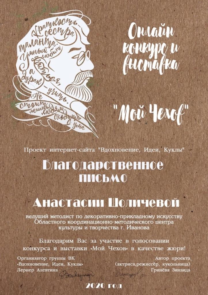 В интернет-сообществе «Вдохновение, идеи, куклы» (социальная сеть «ВКонтакте») состоялись всероссийский online-конкурс и оnline-выставка «Мой Чехов», посвящённые 160-летию со дня рождения великого русского писателя Антона Павловича Чехова.