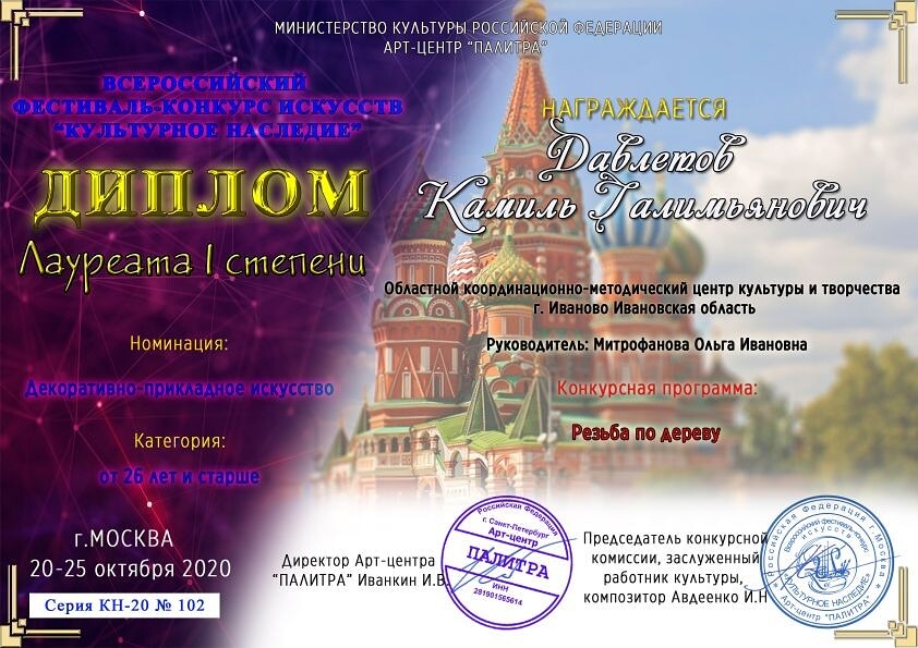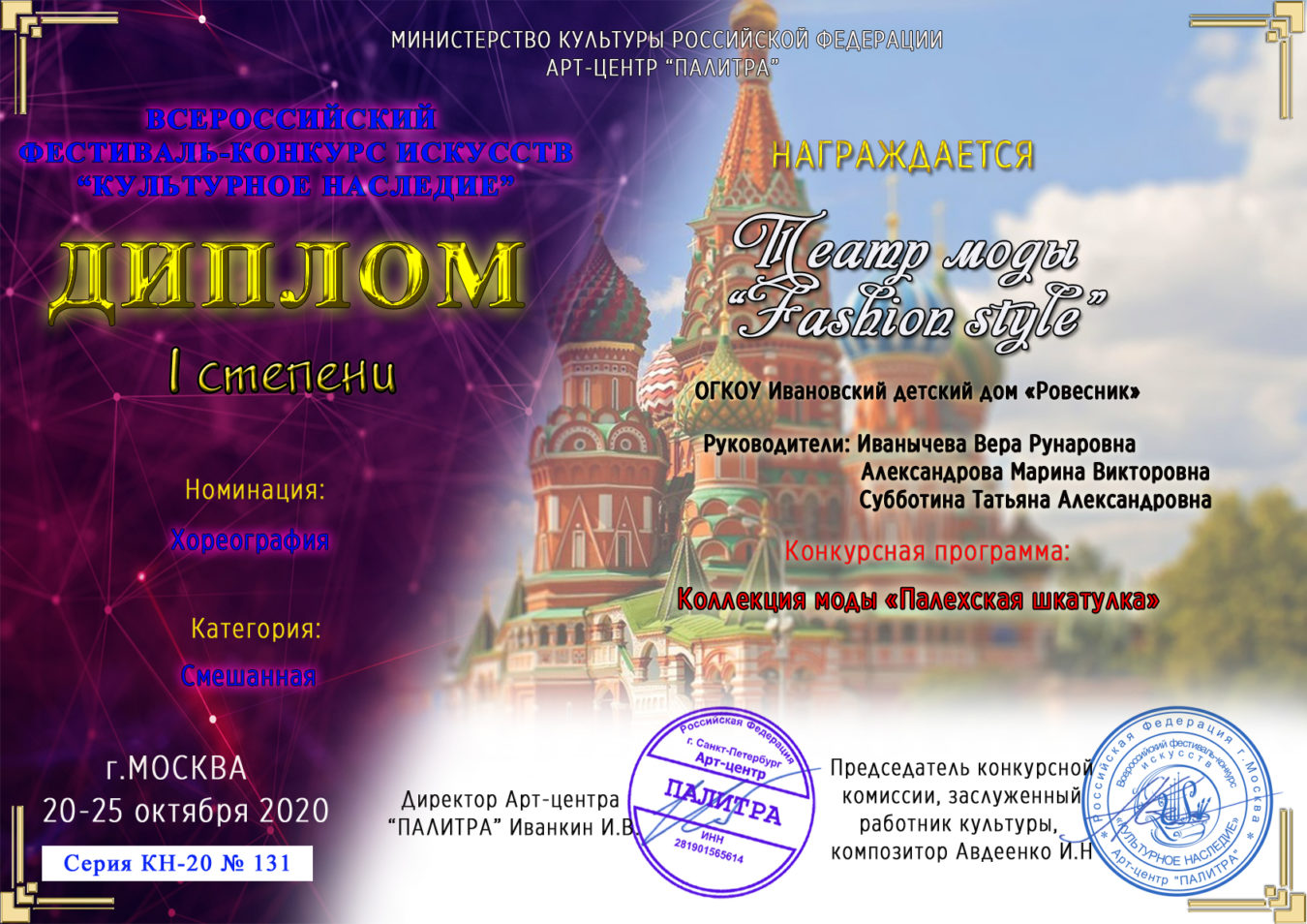 Завершился Всероссийский фестиваль-конкурс искусств «Культурное наследие». Организатор - Арт-центр «Палитра» (г. Москва) при поддержке Министерства Культуры РФ.