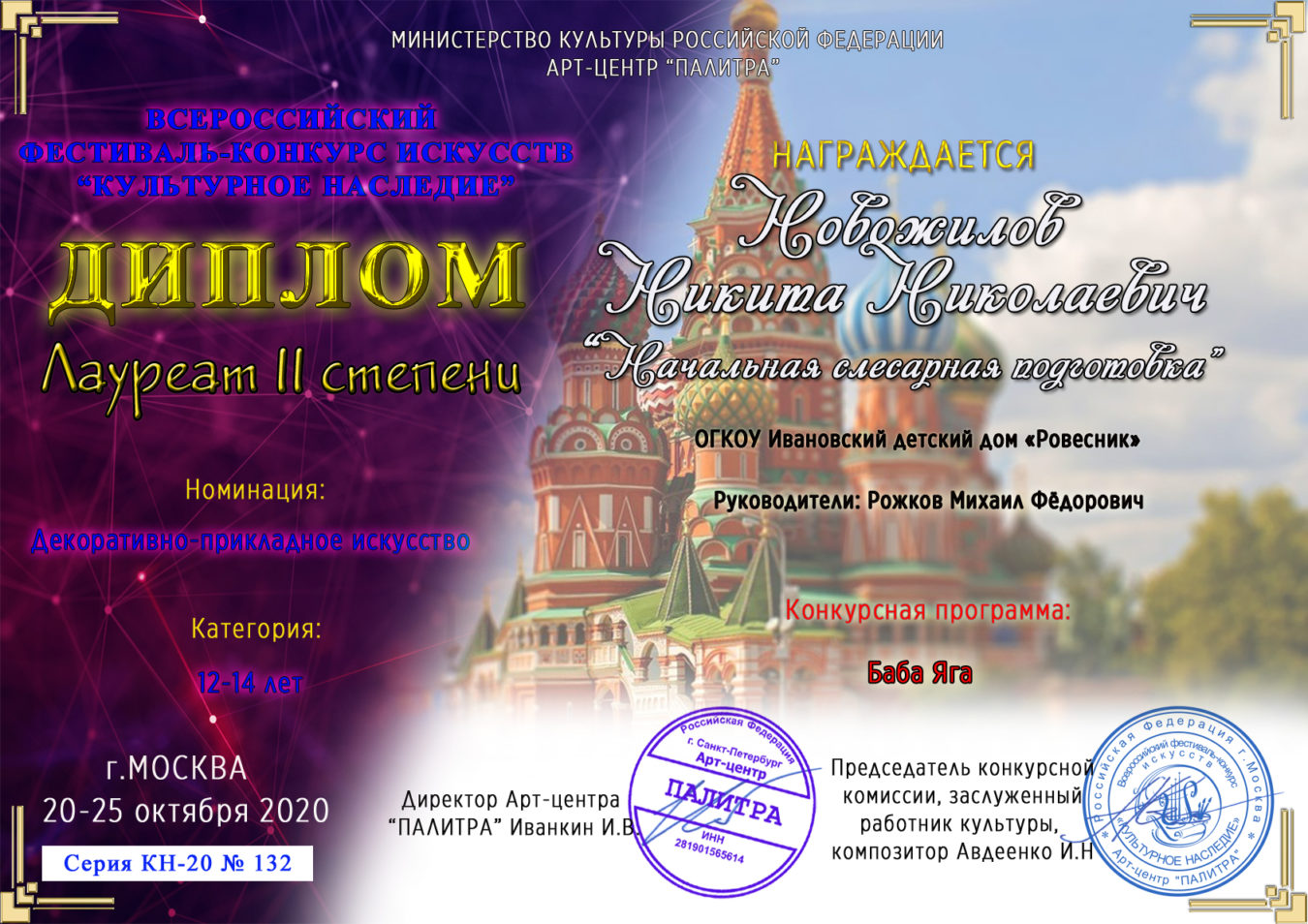 Лауреатом II степени в номинации «Декоративно-прикладное искусство» стал Никита Новожилов ученик студии «Начальная слесарная подготовка» Ивановского детского дома «Ровесник» (г. Иваново, возрастная категория 12-14 лет) за композицию из медной проволоки «Баба Яга».