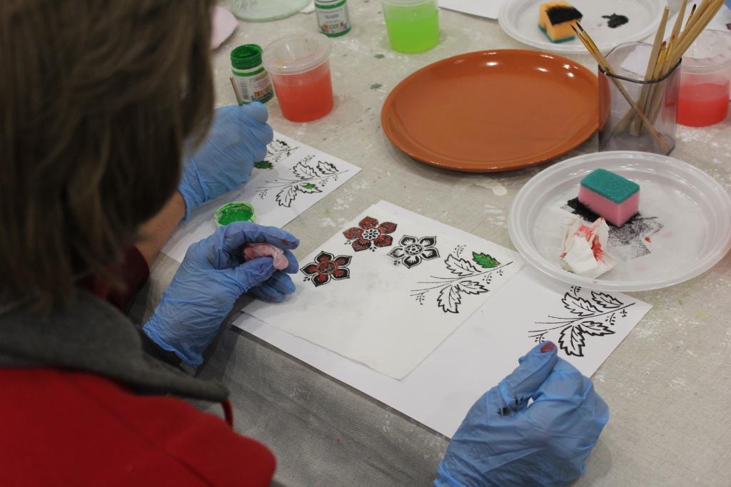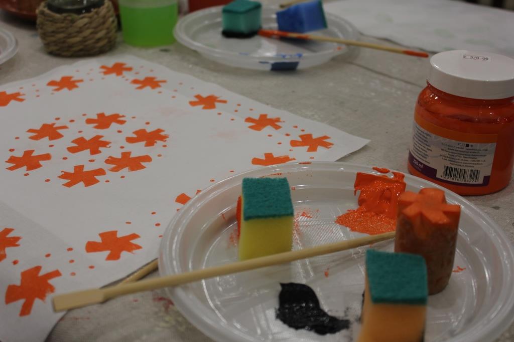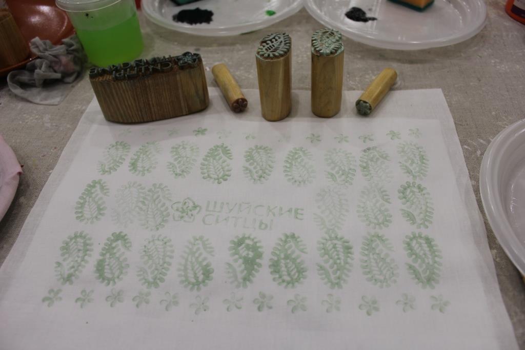 Занятия проводились малыми группами в выставочном зале Музея ивановского ситца, где в эти дни проходила выставка «Шуйские ситцы: два века истории». Научный сотрудник музея Юлия Блавдзевич провела для участников экскурсию по выставке, рассказав о развитии технологий создания тканей на одном из старейших предприятий Ивановской губернии. Затем на практической части занятия под руководством Юлии Андреевны участники смогли попробовать три вида ручной набойки: сажевую, кубовую и верховую, научились печатать на ткани манерами (специальными деревянными штампами), наносить рисунок акриловыми красками, заваривать ткань в красителе индиго, использовать в качестве штампа овощи – морковь или картошку, которым можно придать любую форму при помощи канцелярского ножа.