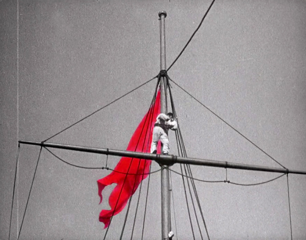 На премьерный показ в Большой театр картину привезли прямо с монтажного стола. Перед этим возникла идея раскрасить кисточкой вручную 108 кадров с флагом, что вызвало огромный эмоциональный взрыв у зрителей, увидевших в черно-белом фильме красный флаг над броненосцем и дало повод назвать фильм «Броненосец Потемкин» первым цветным советским фильмом.