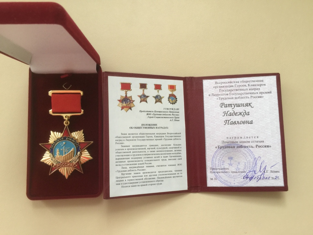 Председатель Центрального правления Всероссийской общественной организации «Трудовая доблесть России» А.Г. Лёвин наградил художественного руководителя ансамбля народной музыки «Малинка» почётным знаком отличия «Трудовая доблесть Россия» Ратушняк Надежду Павловну за большие успехи в культурной деятельности России.