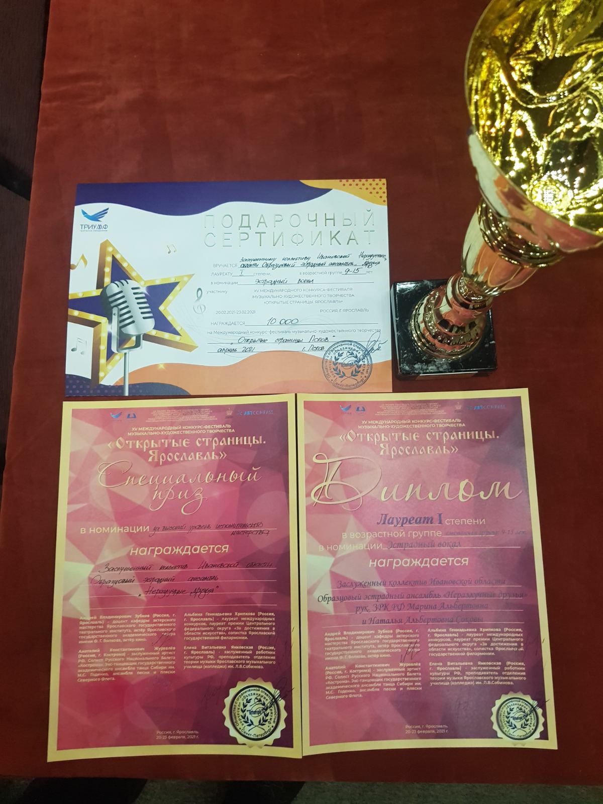 А 22 февраля образцовый эстрадный ансамбль «Неразлучные друзья» и студия «Арлекино» приняли участие в XIII Международном конкурсе-фестивале музыкально-художественного творчества «Открытые страницы» в г. Ярославле. Участницы ансамбля «Неразлучные друзья» стали обладателями диплома лауреата 1 степени в номинации «Эстрадный вокал», а воспитанники цирковой студии «Арлекино» были награждены дипломами лауреатов 1 и 2 степени.
