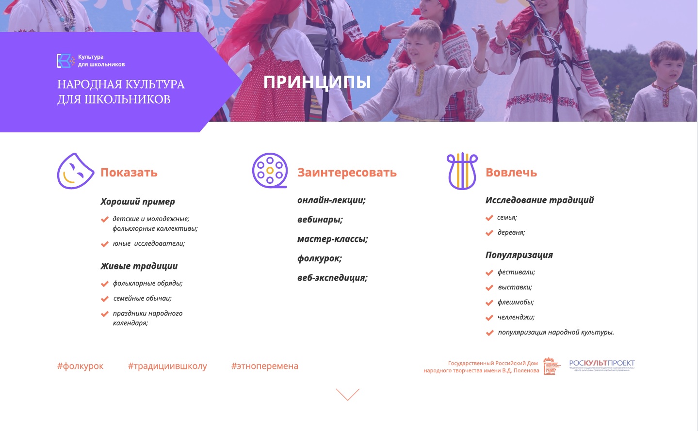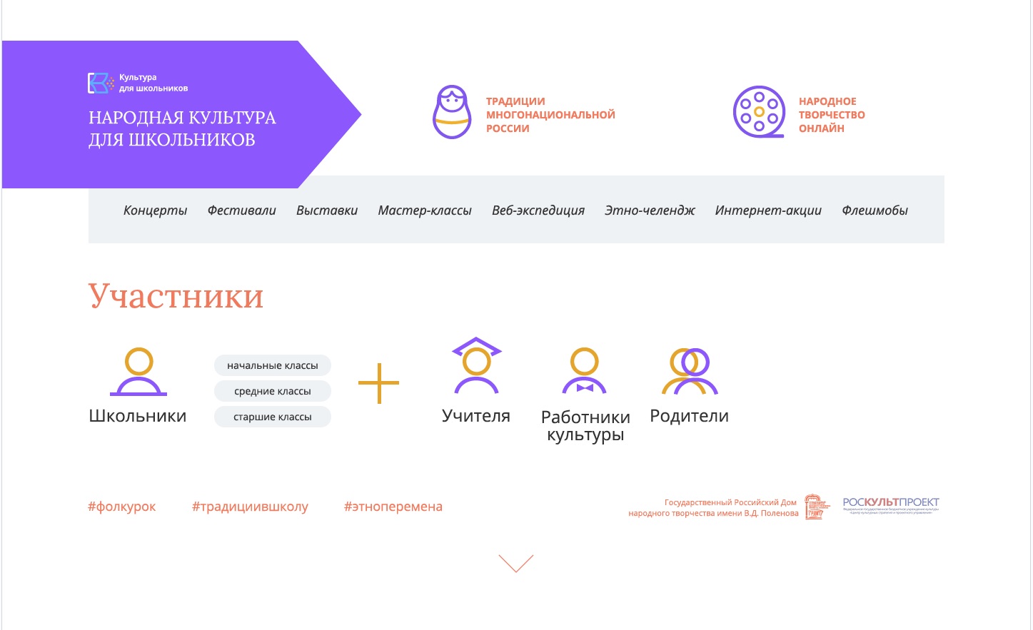Напомним, проект реализуется Министерством культуры Российской Федерации и Министерством просвещения России при участии Государственного Российского Дома народного творчества имени В.Д. Поленова. Задачи проекта - знакомство школьников с многонациональными традициями России, вовлечение в активную исследовательскую и творческую деятельность через современные, популярные среди молодёжи форматы. Челленджи, флешмобы, веб-экспедиции, фольклорные онлайн-марафоны пройдут во всех регионах страны. Официальные хэштеги акции - #фолкурок #традициившколу #этноперемена. Уже сейчас, написав эти хэштеги в поисковиках соцсетей, можно увидеть многочисленные примеры мероприятий, которые проводят наши коллеги по всей стране.