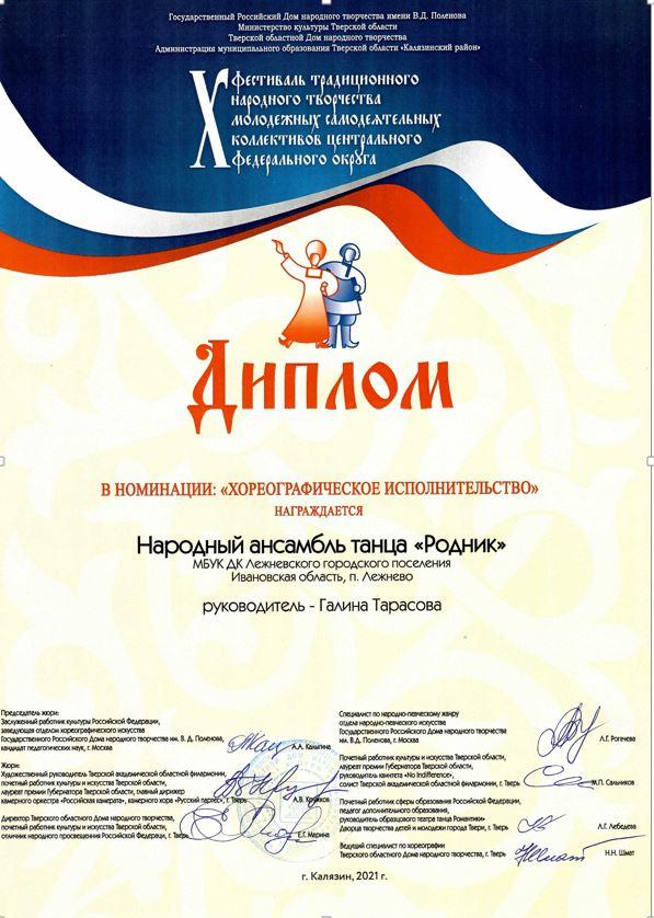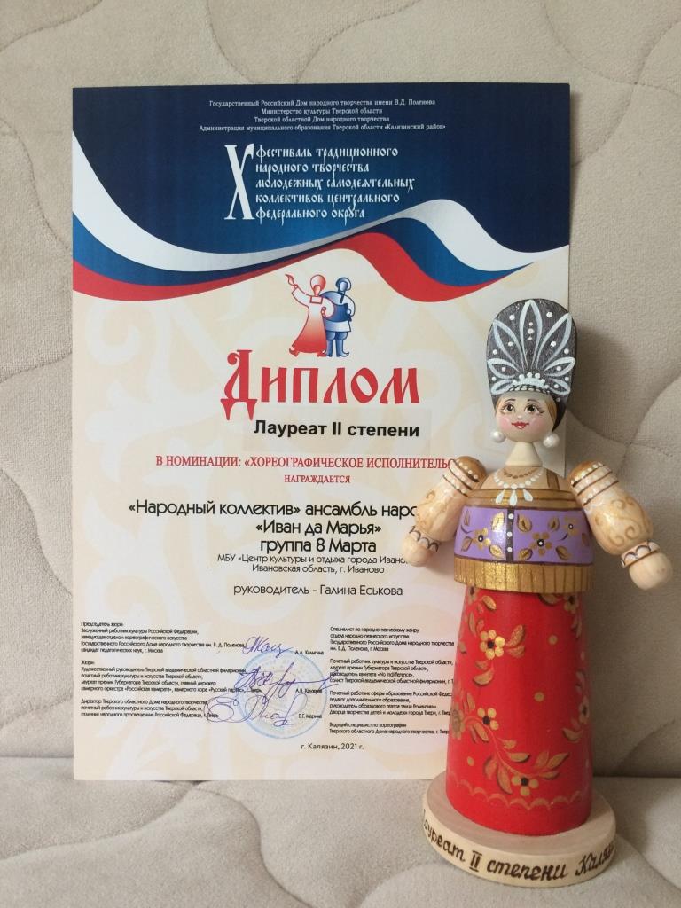 Ивановскую область на фестивале представили два коллектива: это народный ансамбль танца «Родник» городского Дома культуры поселка Лежнево, руководитель Г.А. Тарасова, и народный коллектив ансамбль народного танца «Иван да Марья» МБУ «Центр культуры и отдыха города Иваново», руководители Г.А. Еськова, А.Г. Михеев. Творческие коллективы неоднократно с успехом представляли наш регион на всероссийских и международных фестивалях хореографического искусства, и в этот раз выступление коллективов было высоко оценено членами жюри. В номинации «Хореографическое искусство» группа «8-е марта» ансамбля «Иван да Марья» удостоена диплома лауреата II степени, старшая группа «Иван да «Марья» и ансамбль «Родник» удостоены звания дипломанта фестиваля, средняя группа ансамбля «Иван да Марья» получила диплом участника. Также наши юные таланты удостоены специального приза Особого конструкторского Бюро Московского энергетического института «За выразительное исполнение танца» и сертификат победителя фестиваля-конкурса, награды получили солистка ансамбля «Родник» Елизавета Тарасова и средняя группа ансамбля «Иван да Марья». Мы от души поздравляем руководителей хореографических коллективов и всех участников с очередной победой и желаем дальнейших творческих успехов на поприще народного искусства.