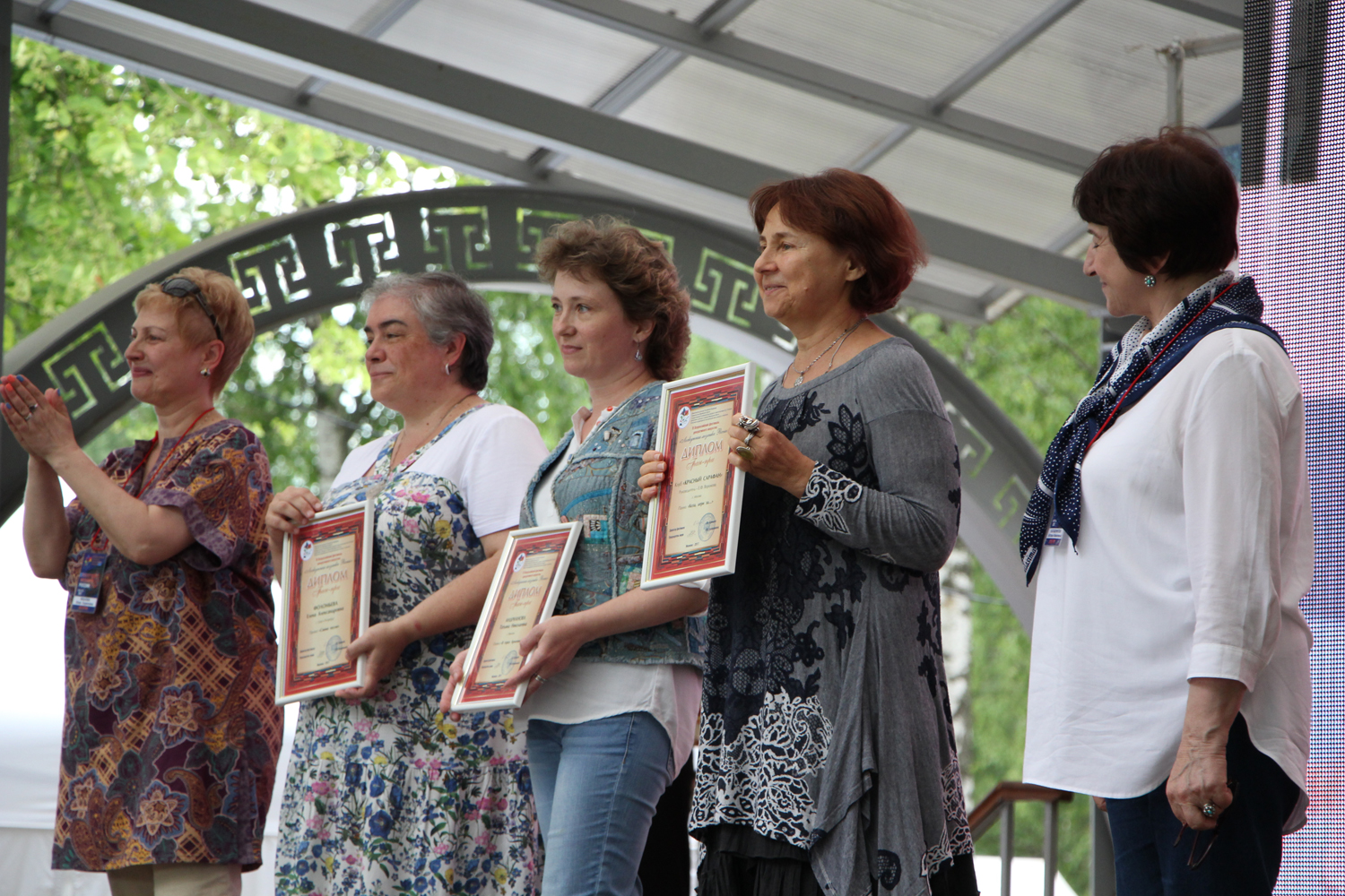 Главным событием ярмарки стала, конечно же, церемония награждения победителей XI Всероссийского фестиваля декоративного искусства «Лоскутная мозаика России». Участников фестиваля поприветствовал заместитель директора департамента культуры и туризма Ивановской области Сергей Александрович Жемулин, отметивший большое значение лоскутного фестиваля для региона. Поздравили победительниц автор идеи лоскутного проекта в Иванове – Юлия Борисовна Иванова, председатель судейской коллегии Наталья Моисеевна Калашникова, директор фестиваля Ольга Борисовна Кривцова, а также уважаемые судьи конкурса. Множество добрых слов нашлось у них для каждой участницы. Как отметила Наталья Моисеевна, уровень работ с каждым фестивалем растет, каждая мастерица совершенствуется. Не удивительно, что в этом году на «Лоскутной мозаике» сразу три обладателя Гран-при. Высшего звания в номинации «Лучшее авторское произведение» были удостоены Елена Александровна Фоломьева (г. Санкт-Петербург) и Татьяна Николаевна Андрианова (г. Иваново). Гран-при в номинации «Лучшее коллективное произведение» получил клуб «Красный сарафан» (руководитель – Е.Ф. Воронова, г. Москва).