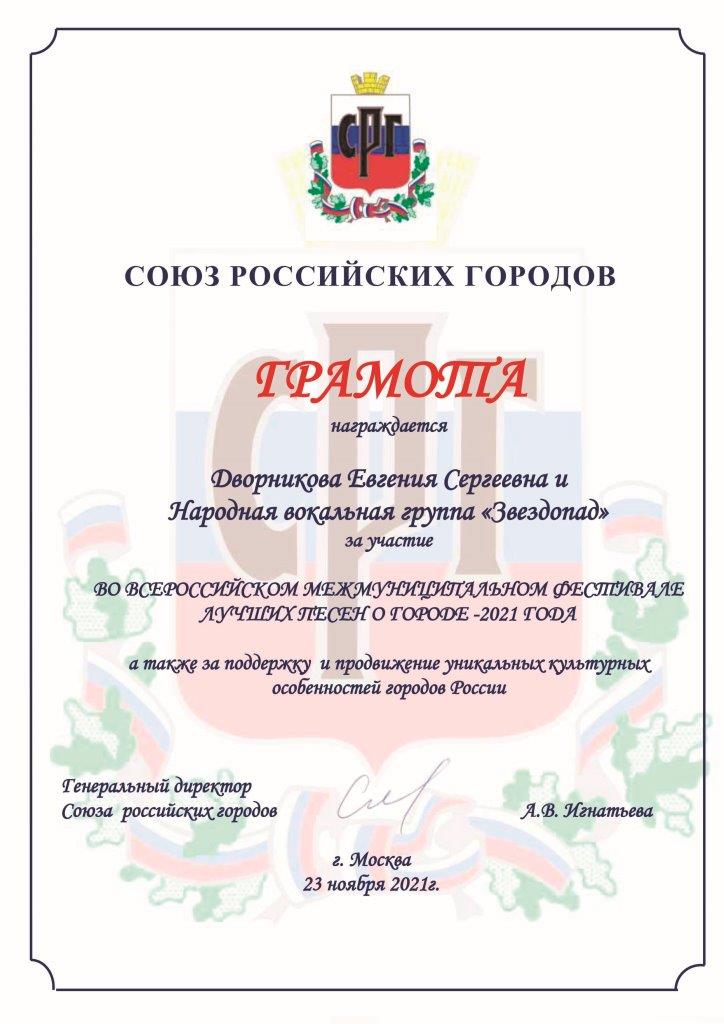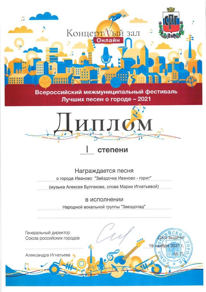 Народный коллектив вокальная группа «Звездопад» областного центра культуры и творчества (руководитель – почетный работник культуры Ивановской области Алексей Булгаков) представили город Иваново на Всероссийском межмуниципальном фестивале-конкурсе «Лучших песен о городе-2021» с песней «Звездочка Иваново - горит!» (музыка - А. Булгакова, слова – М. Игнатьева).