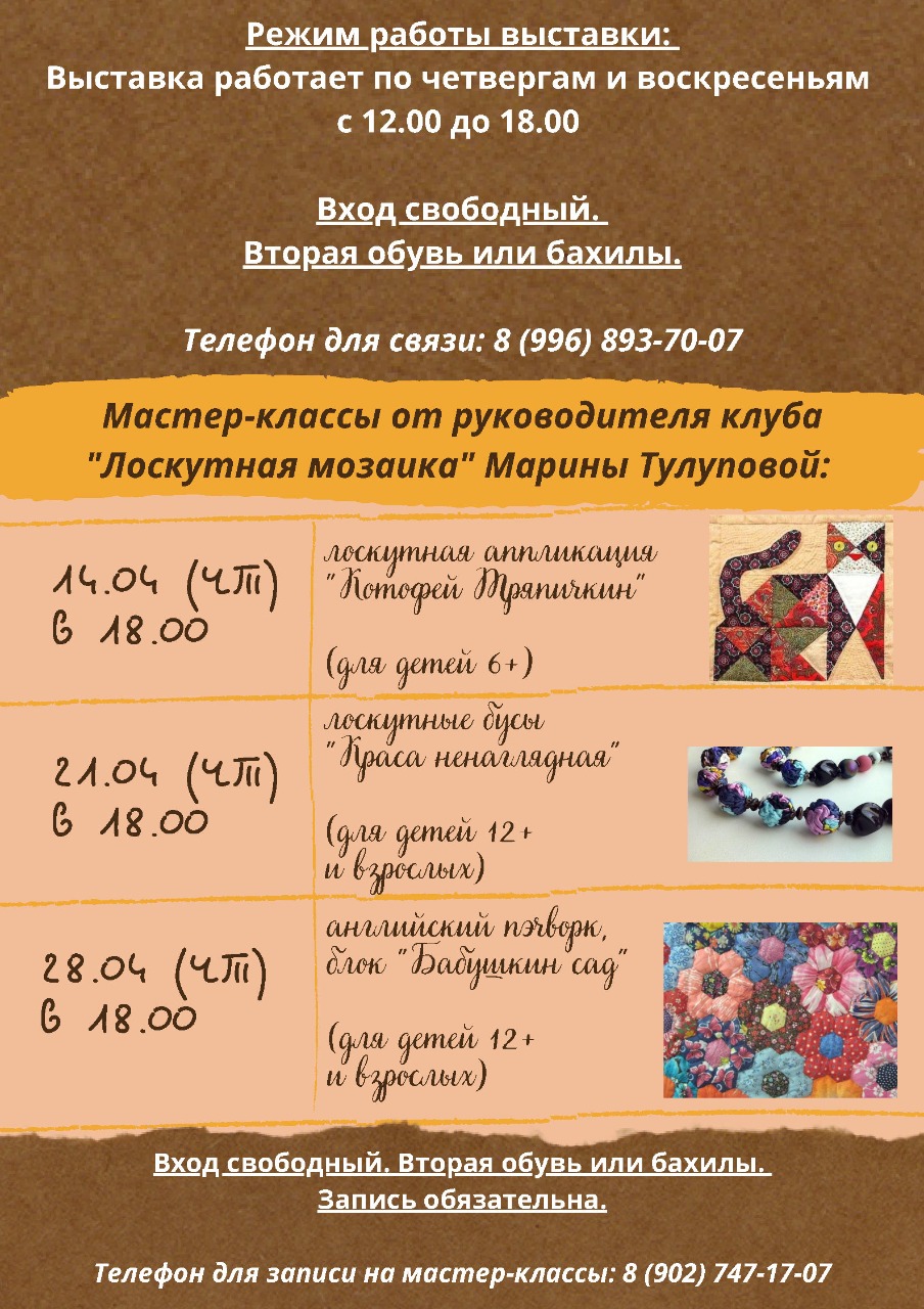 Официальные хэштеги выставки: #лоскутнаямозаика #пасхальнаявыставка #маринатулупова #лоскутноешитьё #пэчворк #квилт #ивановскиеситцы #ОКМЦКТ #кольцова25