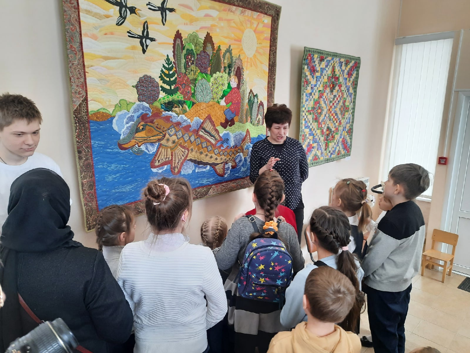 Художественный руководитель клуба-мастерской «Лоскутная мозаика» Марина Тулупова рассказала о принципе создания коллективных работ клуба и провела для детей и взрослых экскурсию по экспозиции. Наибольший интерес у маленьких зрителей вызвали панно на сказочную тематику, а у взрослых – искусно выполненные работы, получившие призовые места на фестивалях и конкурсах.