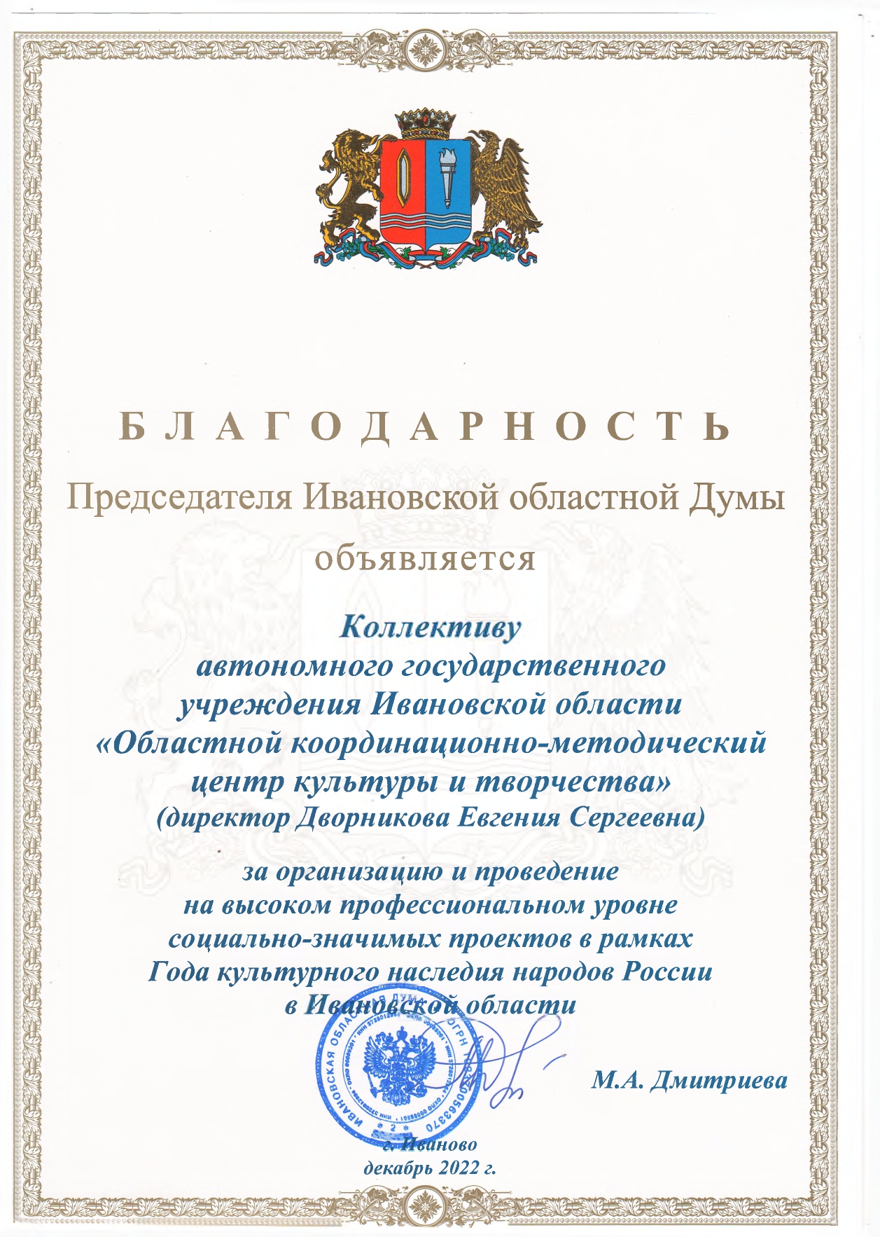 Коллектив Центра культуры и творчества был отмечен за высокий профессиональный уровень организации и проведения социально-значимых проектов в рамках Года культурного наследия народов России в регионе. Председатель Ивановской областной Думы Марина Дмитриева вручила Благодарность директору Центра Евгении Дворниковой.
