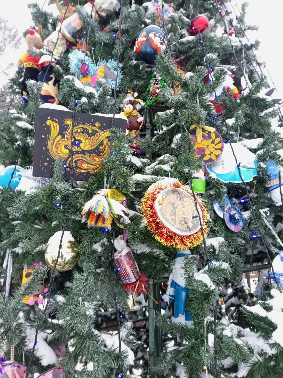 Главные ёлки в общественных пространствах украшаются игрушками, отражающими исторические и культурные мотивы народных художественных промыслов и ремёсел.