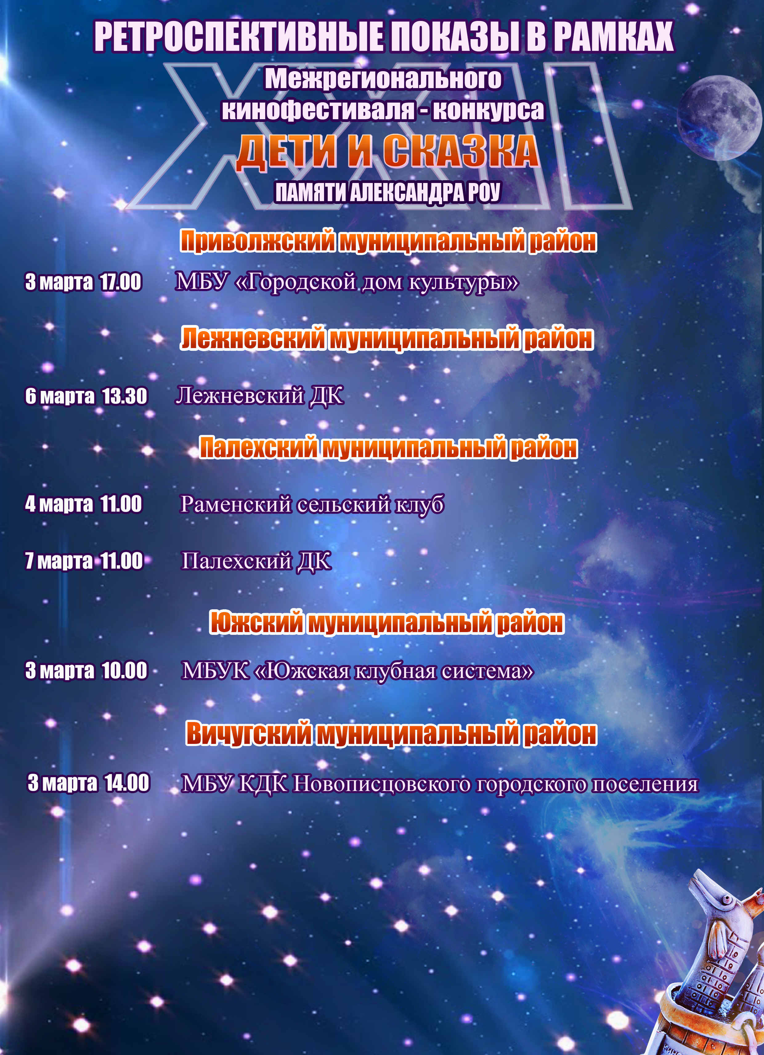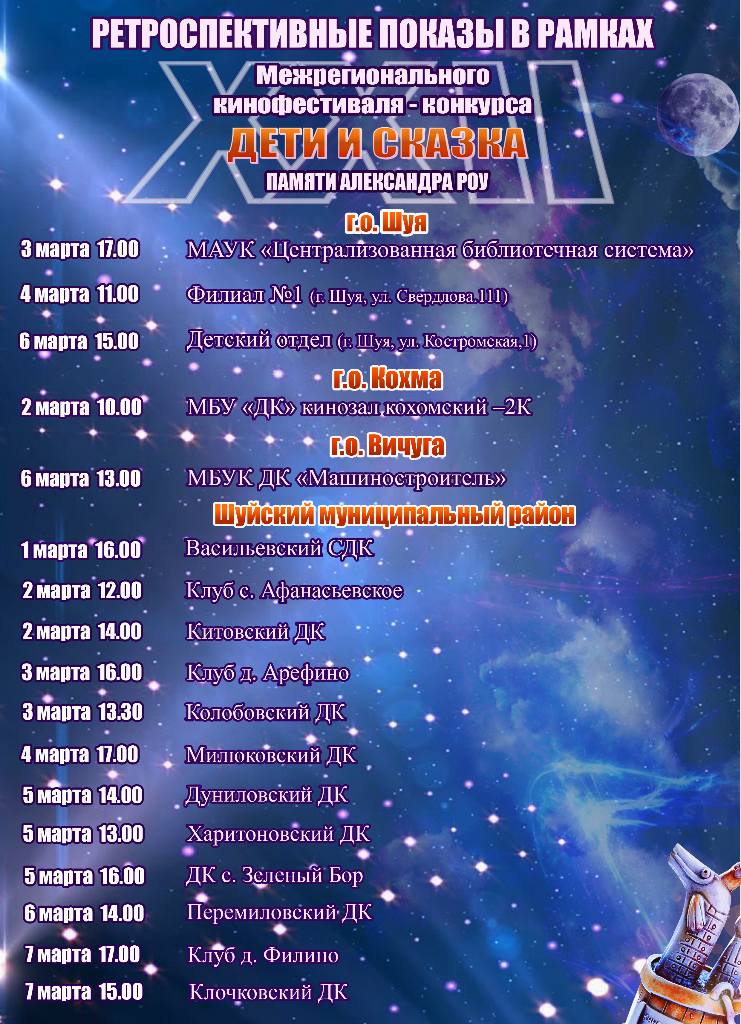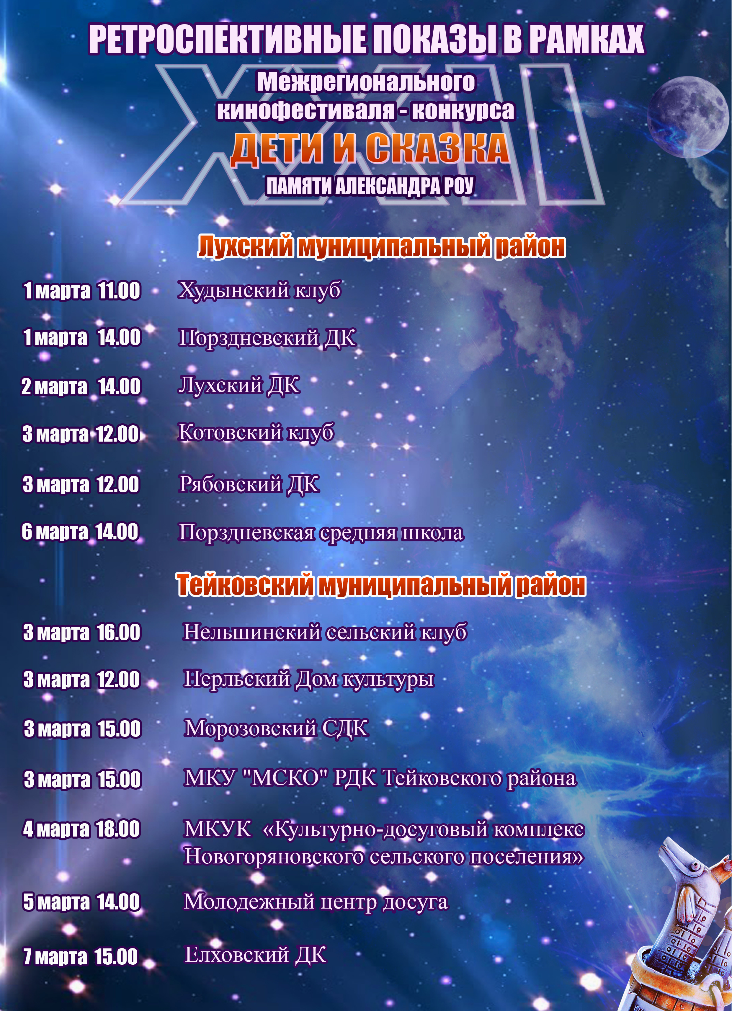 Первые ретроспективные показы пройдут уже 1 марта в Шуйском и Лухском районе. Посмотреть сказки можно будет и в городах Шуя, Кохма и Вичуга, а также Вичугском, Приволжском, Тейковском и Южском районах.