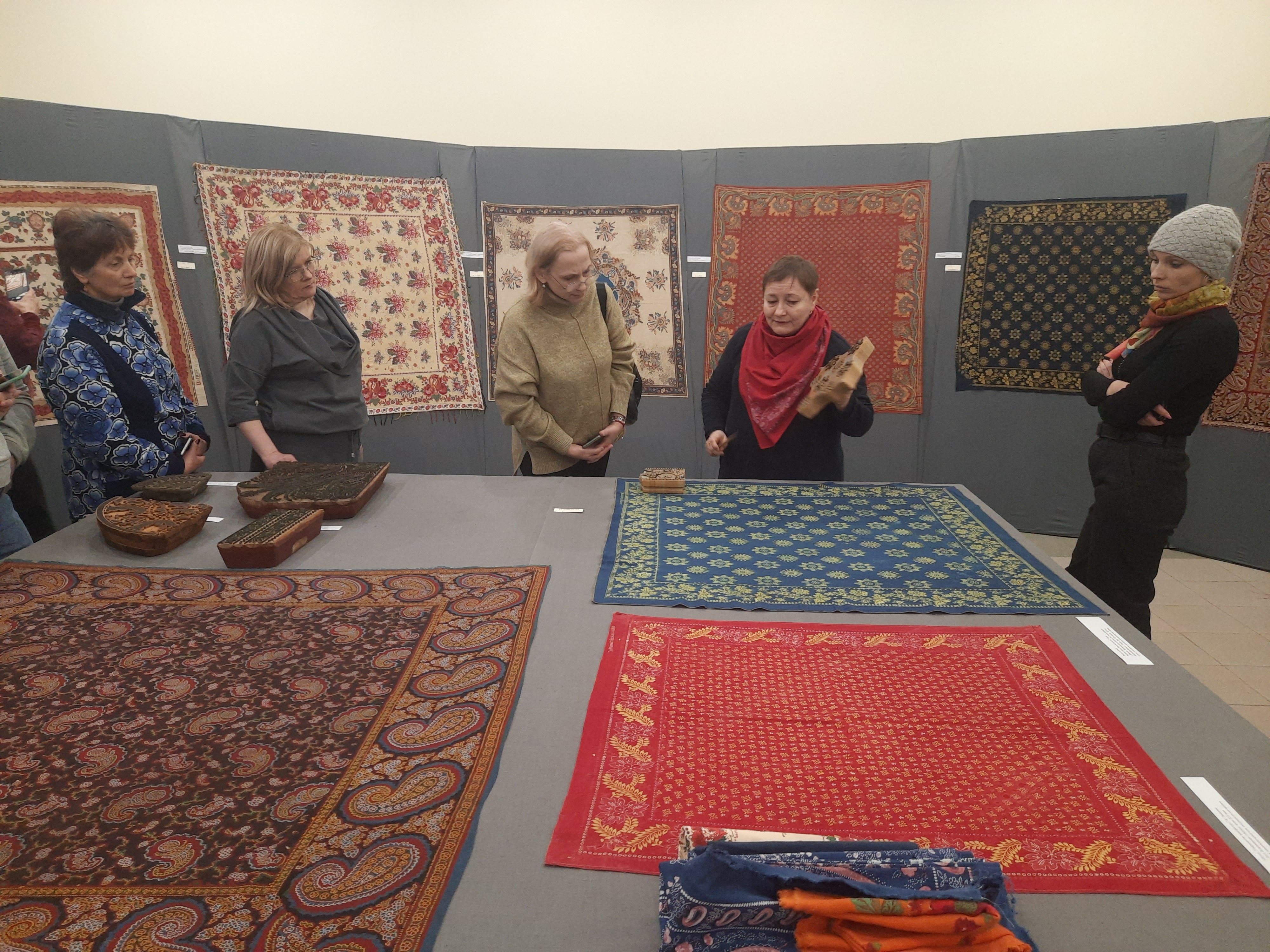 Вместе со старшим научным сотрудником ИГИКМ им. Д.Г. Бурылина Юлией Блавдзевич участники осмотрели выставку платков и инструментов для ручной набойки из фондов музея ивановского ситца и частной коллекции Павла Осипова «Платочные истории», услышали занимательную лекцию об истории платочного промысла, о восстановленной технологии ручной набивки, о производстве современных платков на основе старинных, а также узнали о традиционных вариантах вязания платков. После основной части занятия участники посетили обзорную экскурсию по постоянной экспозиции музея «Ивановский текстиль. История и современность» и увидели выставку авторских кукол «Однажды…»