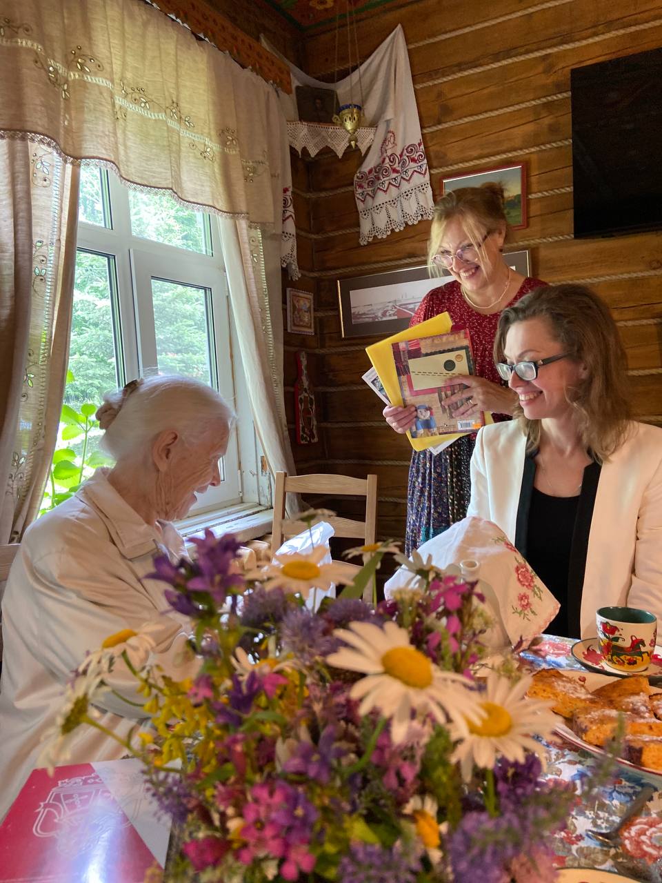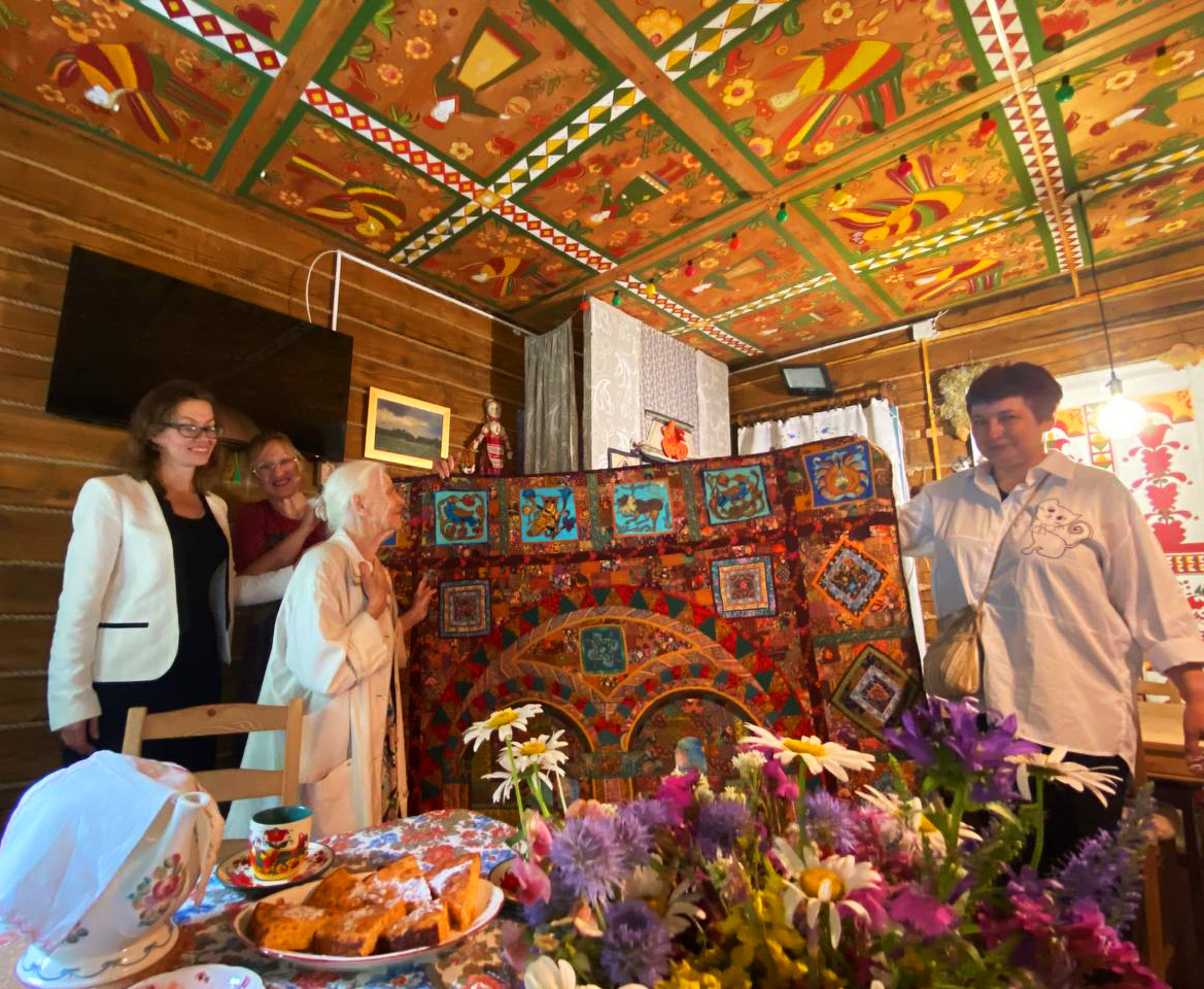 Руководитель клуба лоскутного шитья «Свой дом» – Габышева Юлия Николаевна, несмотря на почтенный возраст (87 лет) до сих пор занимается творчеством, которое ей приносит радость и вдохновение. Также от коллектива создателей лоскутного панно на встрече принимала гостей Ирина Анатольевна Крюковская – гостеприимная хозяйка удивительного гостевого дома «Дача» в г. Южа.