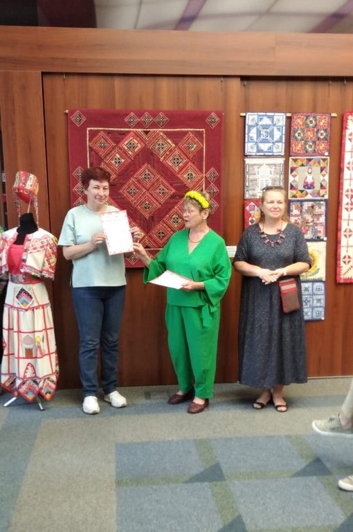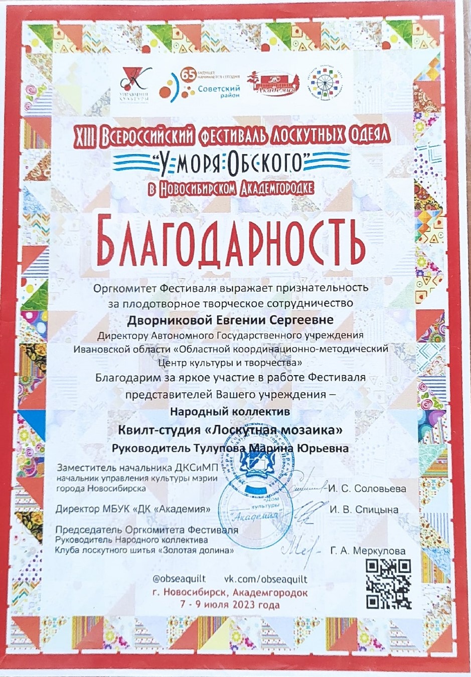 Народный коллектив самодеятельного творчества клуб-студия «Лоскутная мозаика» АГУИО «Областного координационно-методического центра культуры и творчества» в качестве почётного гостя принял участие в фестивале лоскутных одеял «У моря Обского» в г. Новосибирске, который состоялся в июле. В арт-галерее Дома учёных были представлены 6 коллективных панно клуба и международный проект «Русский стиль в лоскутном шитье» из 136 миниквилтов.
