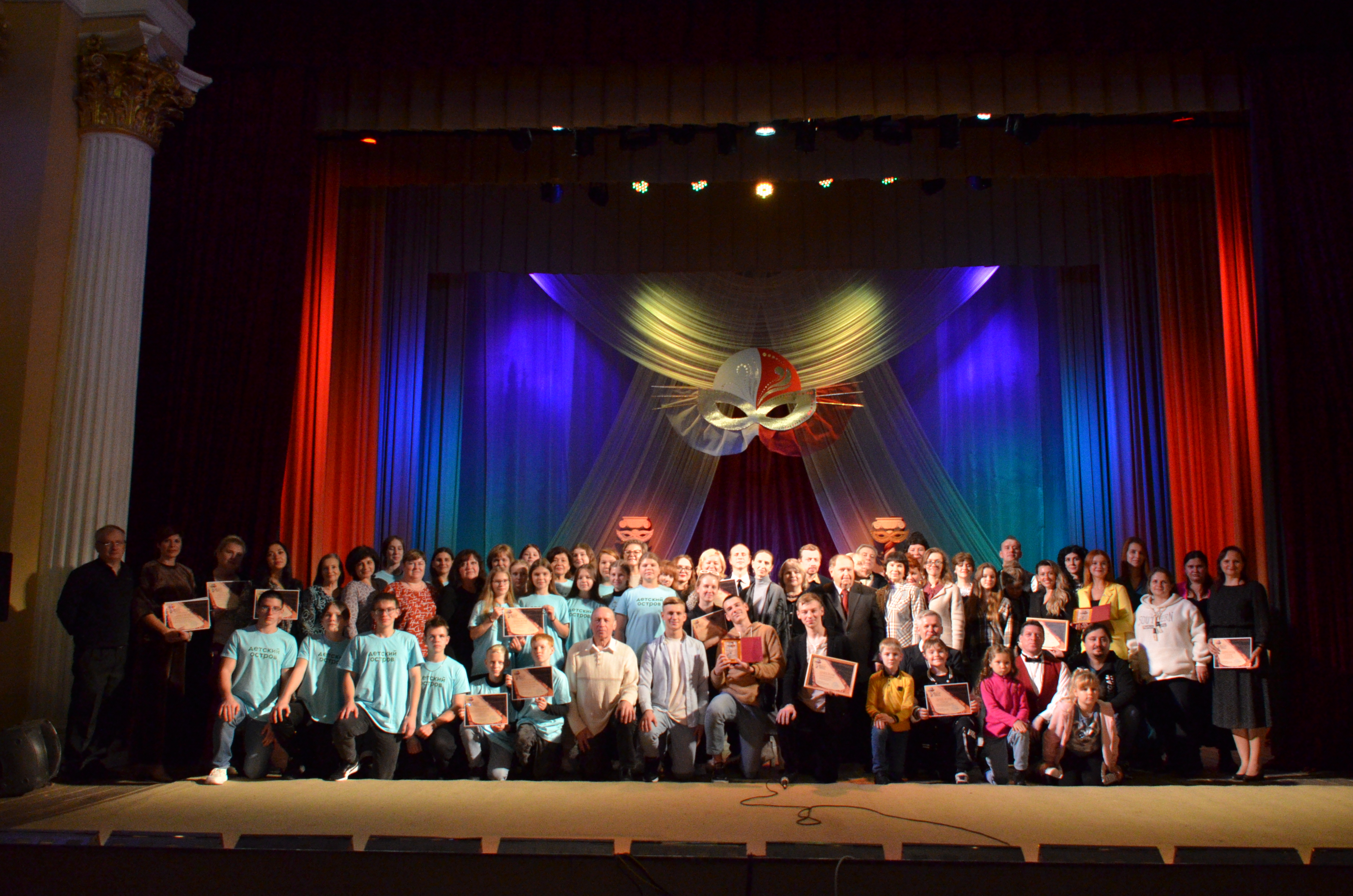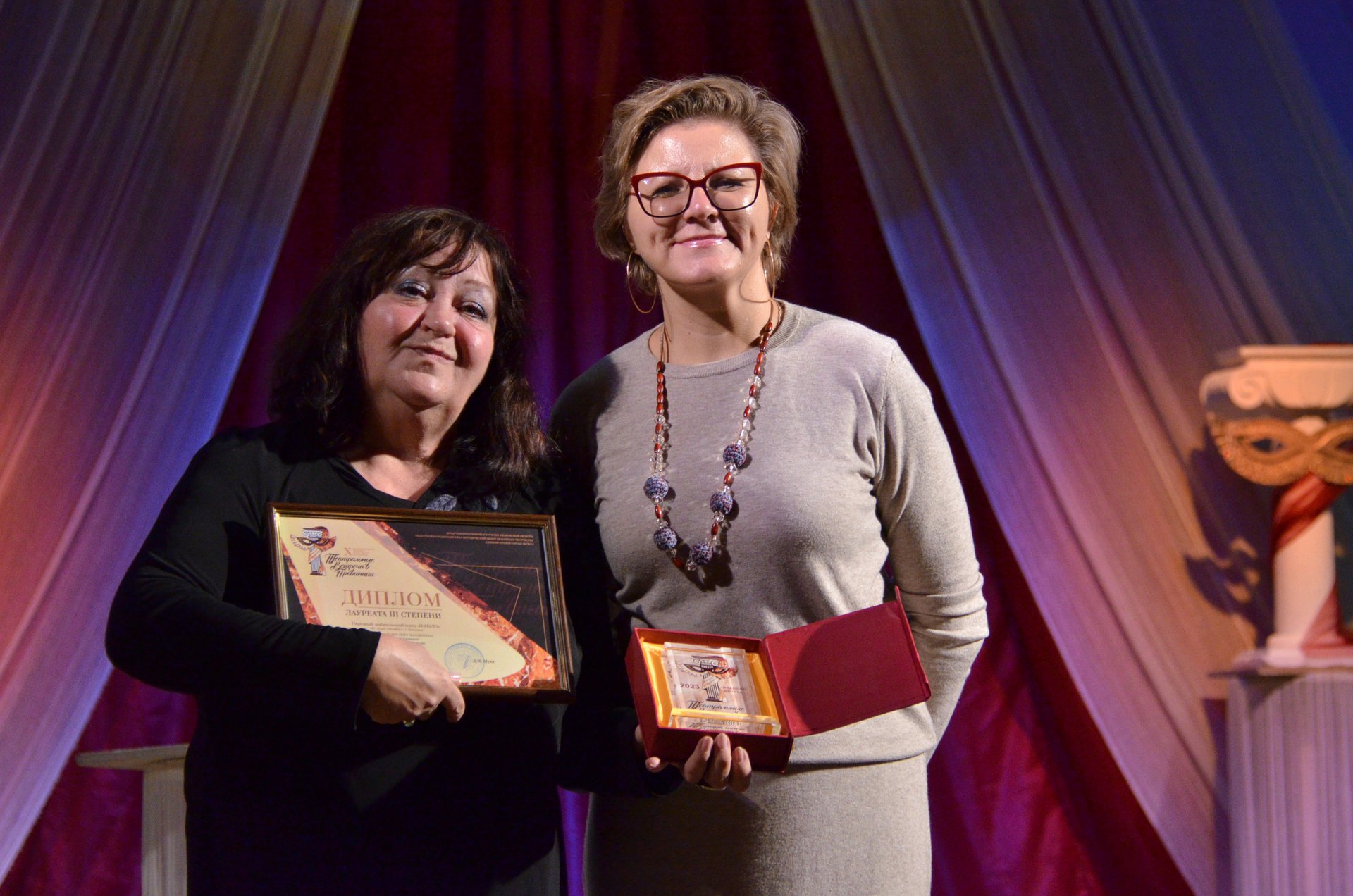 Участникам также вручались специальные призы и дипломы от организаторов и членов жюри. Главной наградой стала заветная статуэтка – бренд фестиваля, это колонна овитая кулисой, к которой прикреплена театральная маска. Эскиз бренда разработали еще 20 лет назад, он изготавливался вручную и был керамическим, но в рамках десятилетия межрегионального фестиваля приз впервые выполнили из стекла.