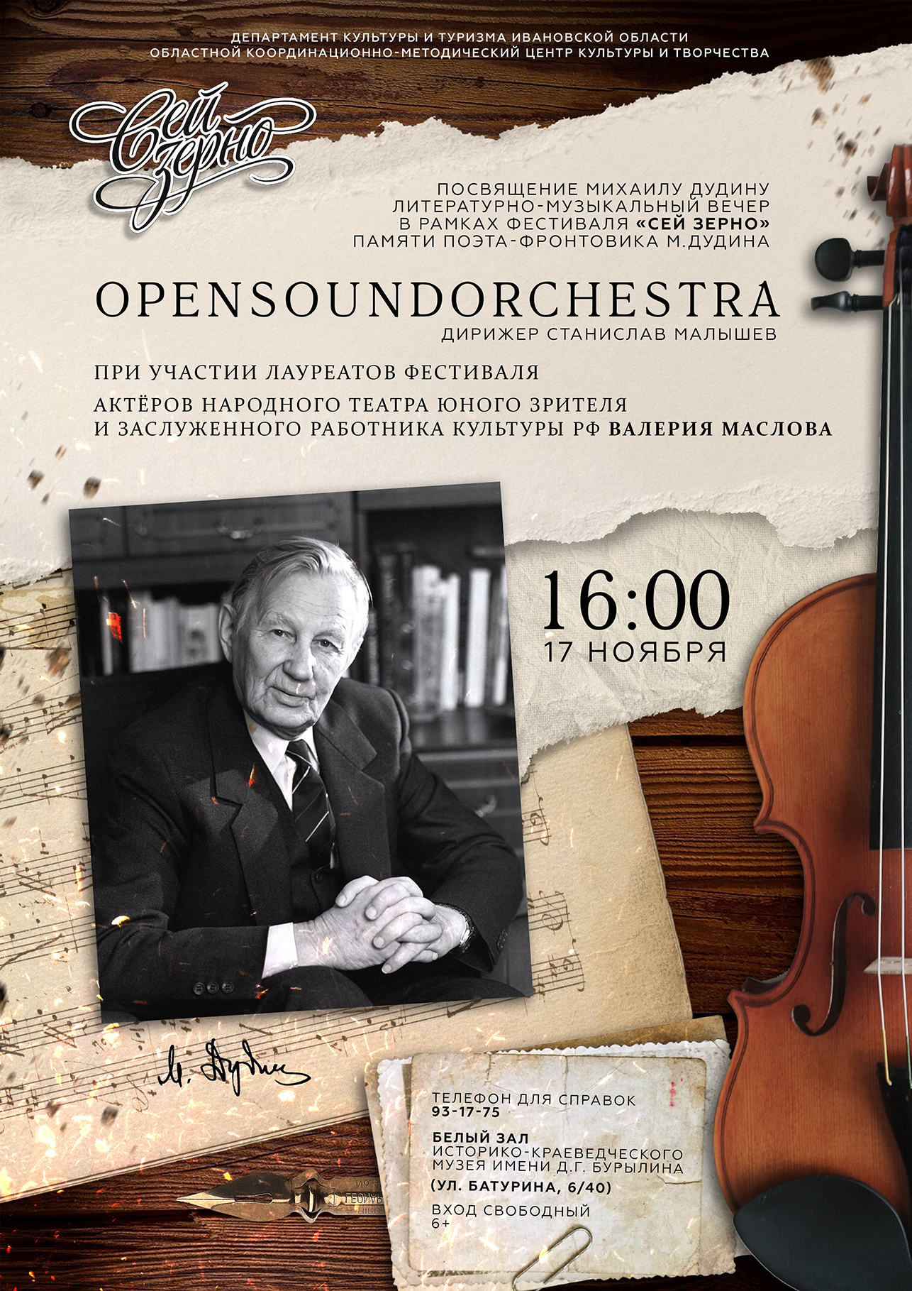 17 ноября в рамках фестиваля в Белом зале Историко-краеведческого музея имени Д.Г.Бурылина пройдет литературно-музыкальный вечер «Посвящение Михаилу Дудину». В мероприятии примет участие оркестр современной музыки OpensoundОrchestra под управлением Станислава Малышева – российского скрипача и дирижера, доцента Московской