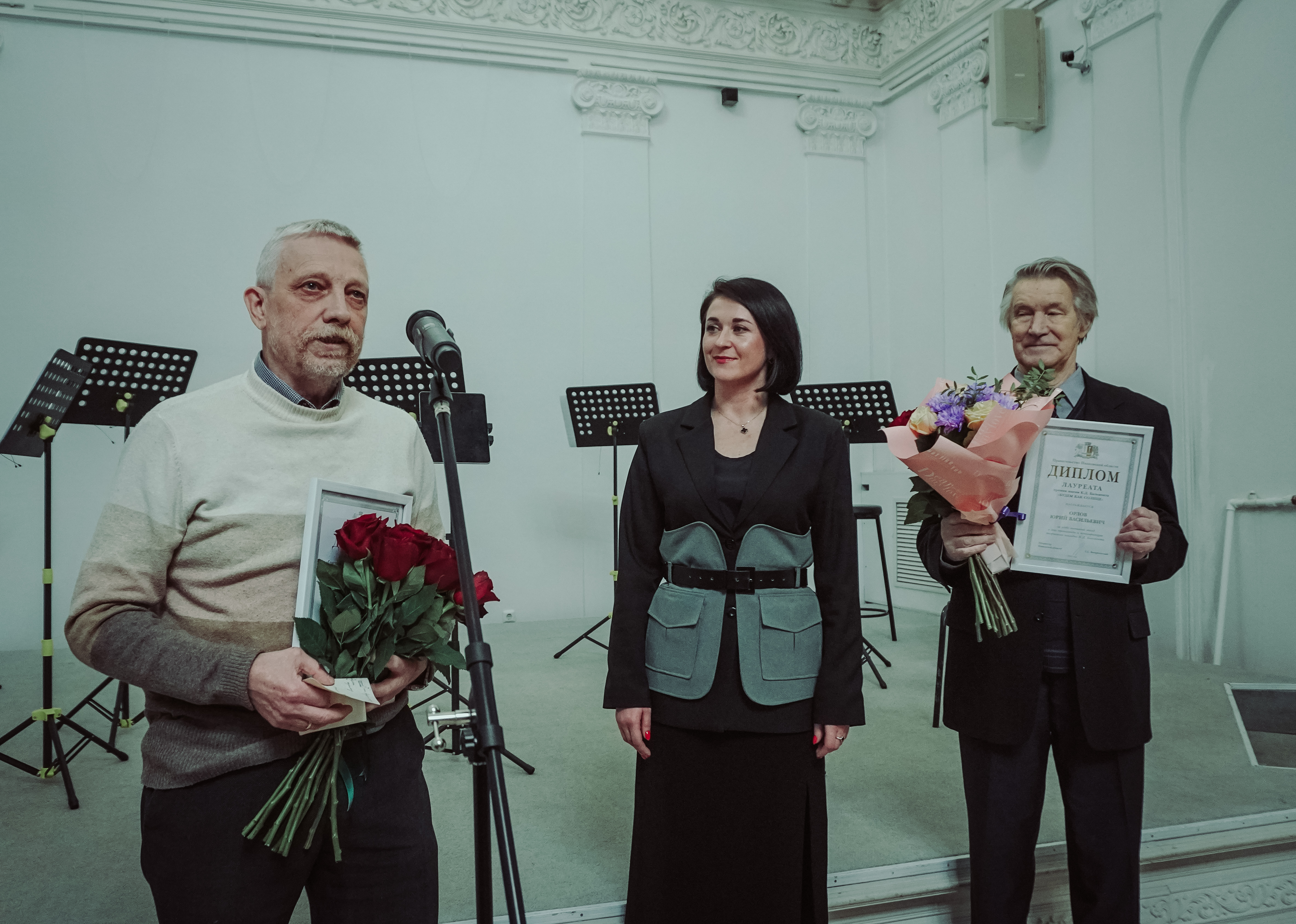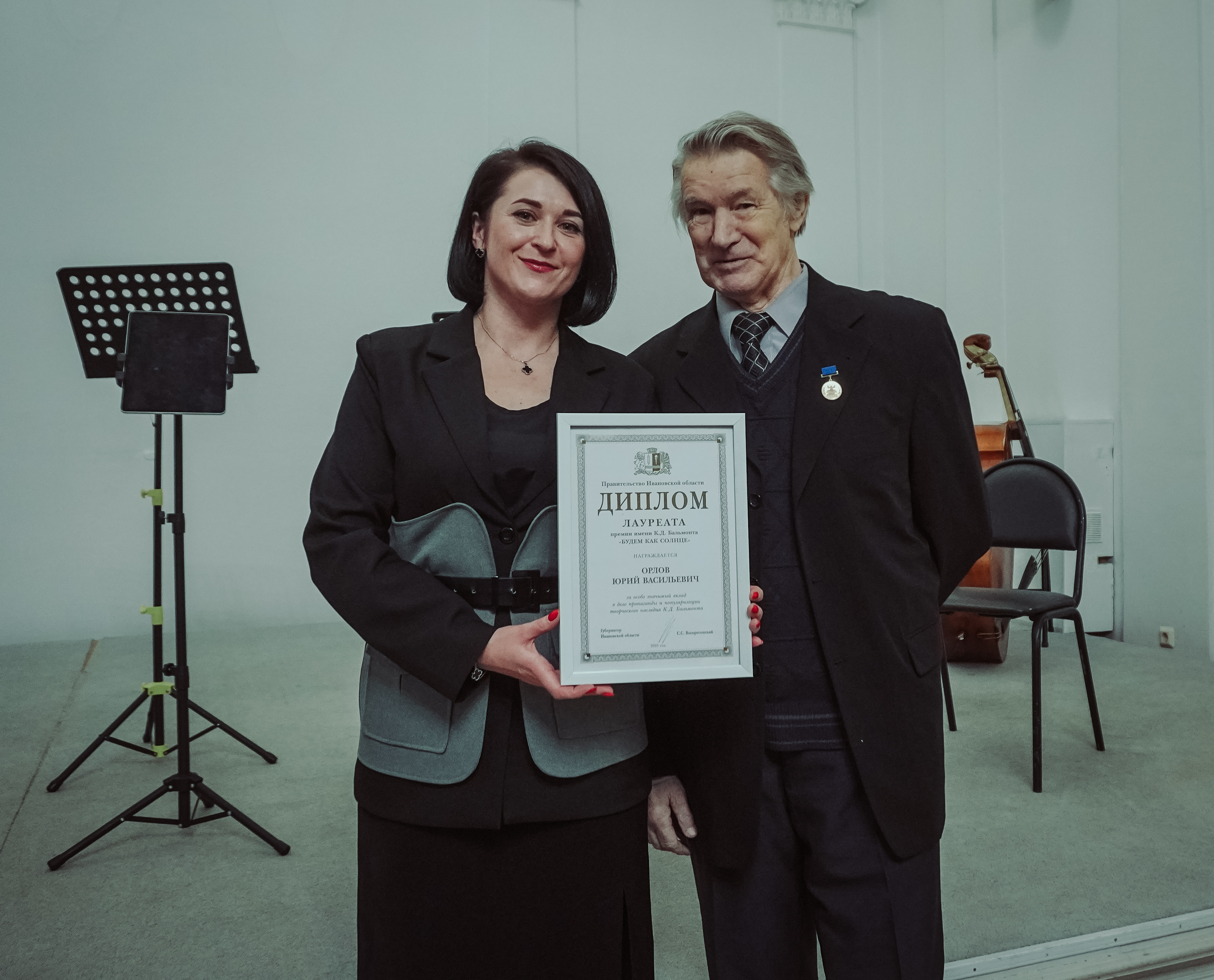 Так же в рамках вечера были вручены две значимые региональные литературные премии. Диплом лауреата премии Константина Бальмонта «Будем как солнце» за особо значимый вклад в дело пропаганды и популяризации творчества Константина Бальмонта присужден Юрию Васильевичу Орлову – заслуженному работнику культуры России, главе Ивановского отделения Союза писателей России. Диплом лауреата областной премии имени Михаила Дудина в номинации «За приобщение к литературному наследию М.А. Дудина, разработку и внедрение в практику новых форм работы, направленных на воспитание у молодого поколения чувства гражданского патриотизма» присужден Владимиру Ефимовичу Колобову – преподавателю ивановского художественного училища имени М.Малютина.