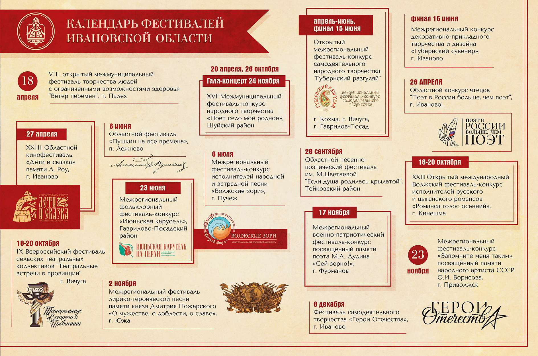 Областной координационно-методический центр культуры и творчества представляет календарь фестивалей Ивановской области, направленных на развитие и сохранение самодеятельного художественного творчества. Фестивальная программа разнообразна по жанрам, в ней представлены все основные виды любительского искусства.