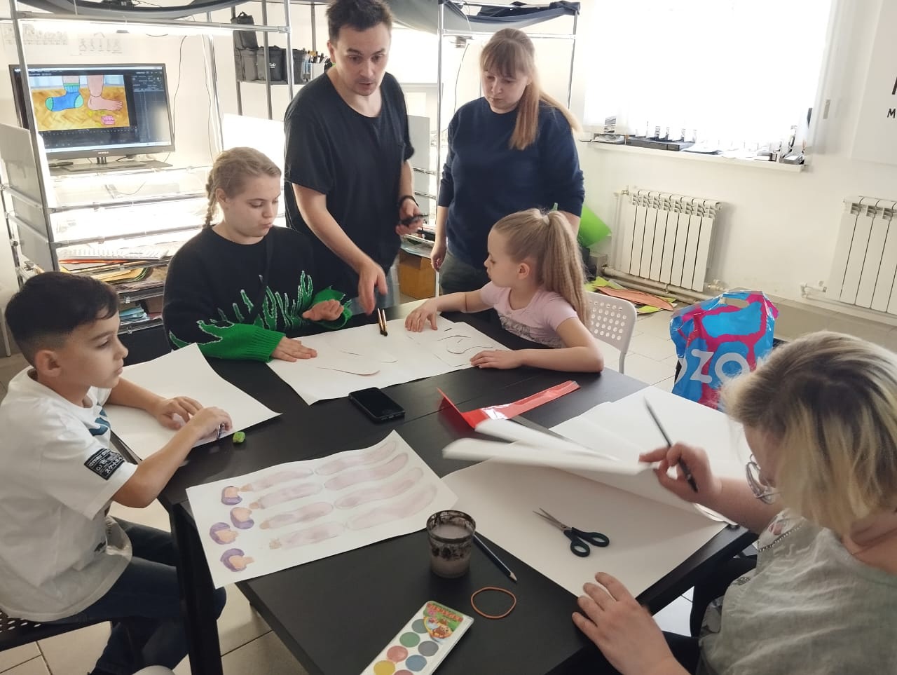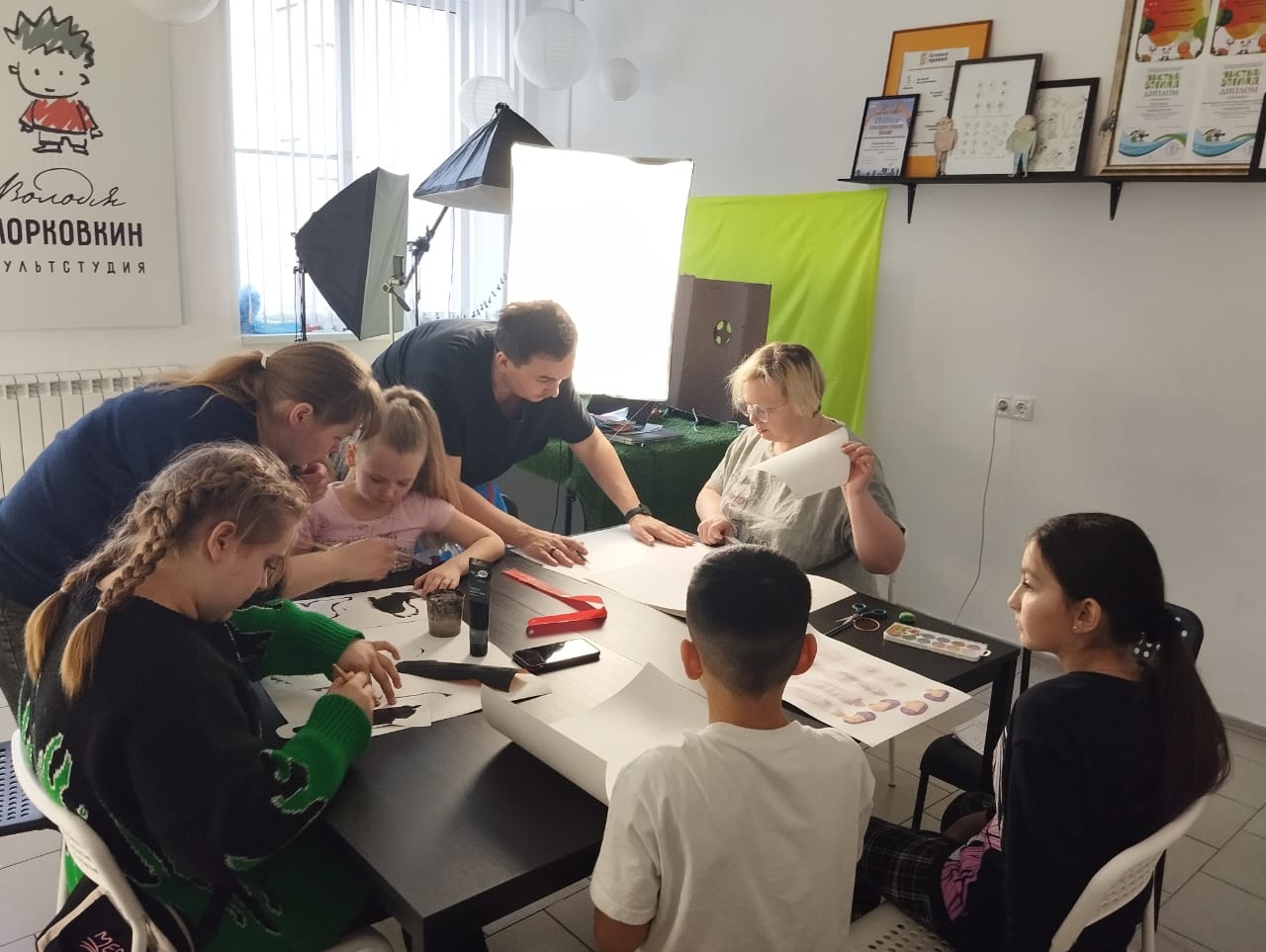В минувший выходной, 14 апреля, в мультстудии «Володя Морковкин» кипела оживленная творческая работа. Ребята, вместе с родителями, под руководством члена жюри межрегионального кинофестиваля-конкурса «Дети и сказка» памяти Александра Роу Владимира Зайцева приступили к реализации совместно придуманной истории из жизни одной многодетной семьи, в которой никогда не бывает скучно.