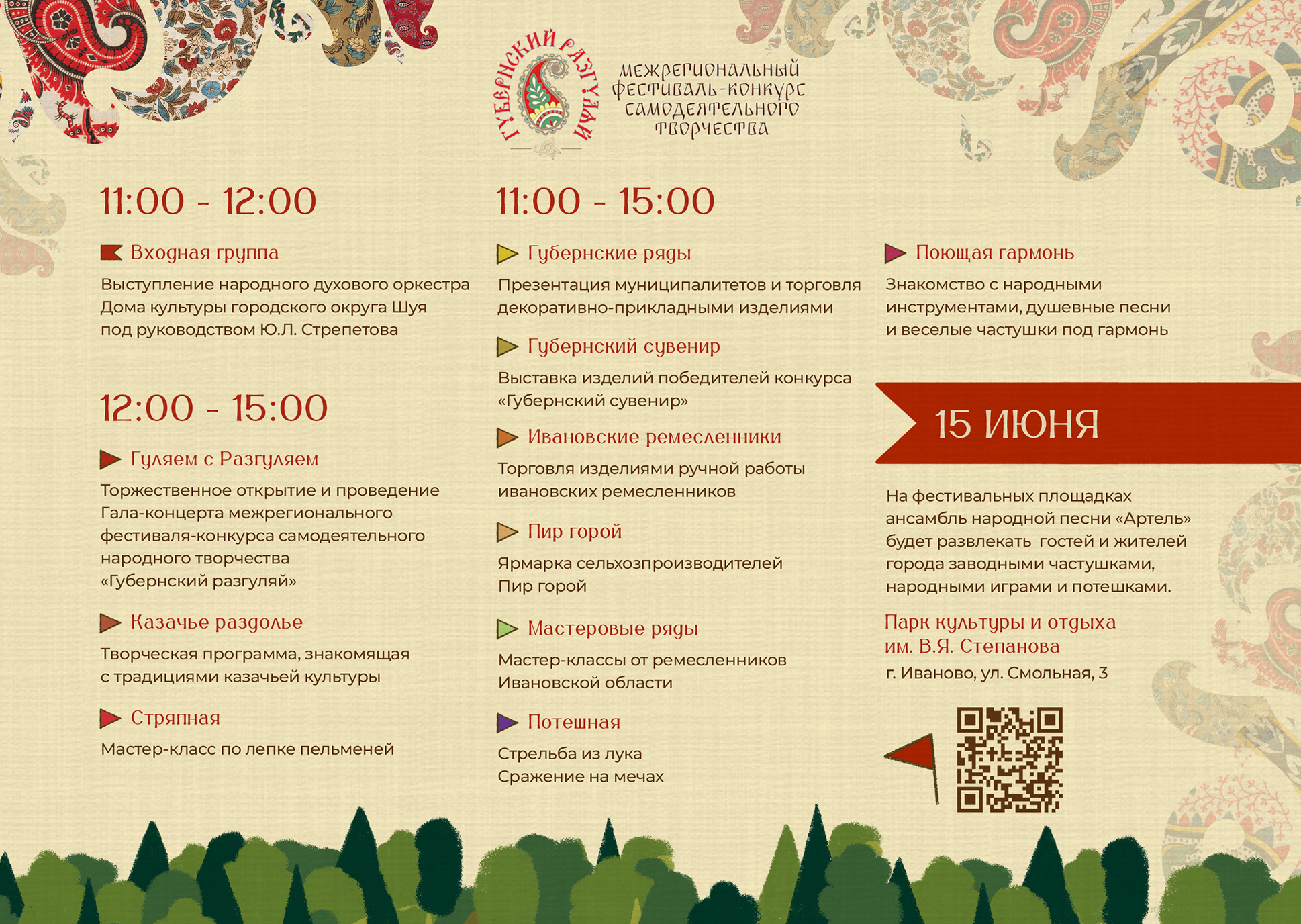 15 июня на главной сцене Парка культуры и отдыха им. В. Я. Степанова г. Иванова соберутся лучшие коллективы и исполнители – победители конкурсной программы межрегионального фестиваля самодеятельного творчества «Губернский разгуляй».