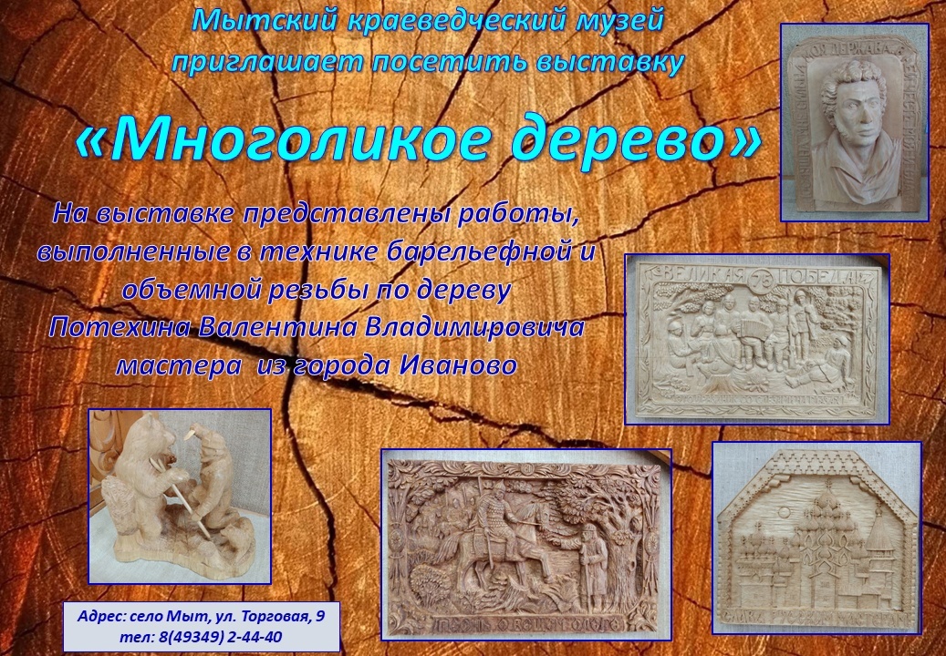 Всё лето в Мытском краеведческом музее Верхнеландеховского района работает персональная выставка «Многоликое дерево» ивановского мастера объёмной резьбы по дереву Валентина Потехина.