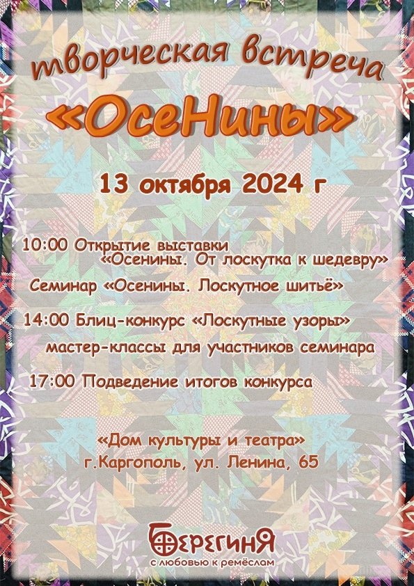 Творческая встреча «ОсеНины» была посвящена 95-летию со дня рождения знаменитой каргопольской мастерицы Нины Александровны Крехалёвой. В рамках встречи прошли мастер-классы «Шаркунок из бересты», «Брелок в технике макраме», «Лоскутный пазл», блиц-конкурс по шитью карманов-лакомников «Лоскутные узоры», показ коллекции творческой мастерской «Каргопольская душегрея» и семинар по лоскутному шитью. На нём директор Детской школы ремёсел г. Архангельска Ирина Огородник рассказала о традиции лоскутного шитья Архангельской области, сотрудник Каргопольского музея Ольга Пригодина познакомила слушателей с музейными коллекциями лоскутного шитья, а Марина Тулупова поделилась опытом работы в народном коллективе «Лоскутная мозаика» и сделала обзор российских фестивалей лоскутного шитья.