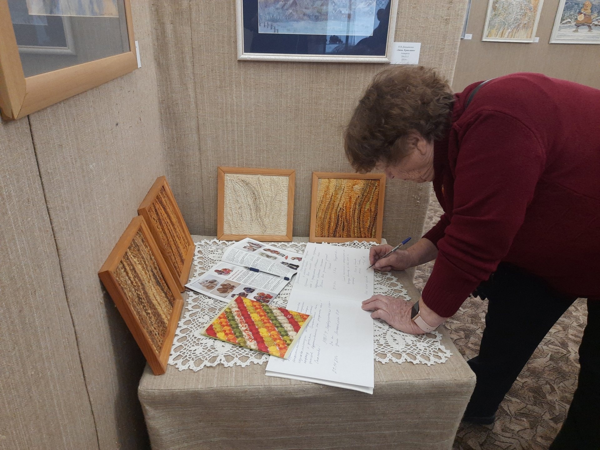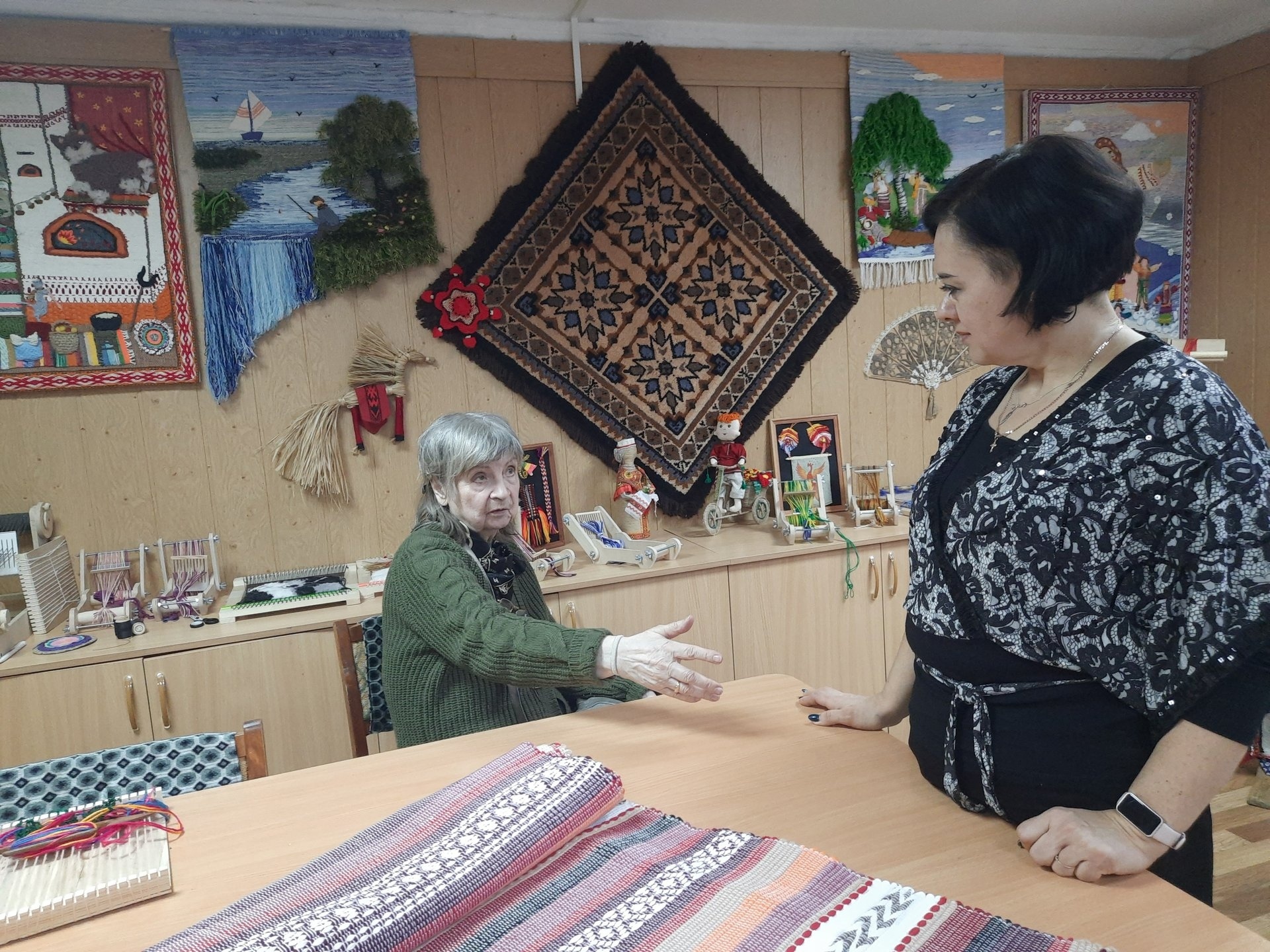 После торжественного открытия Евгения Жарычева провела консультацию по выстраиванию композиции, ритма и выбору цветовой гаммы для мастера студии «Ручное ткачество» Палехского центра творчества и туризма Оксаны Сенцовой.