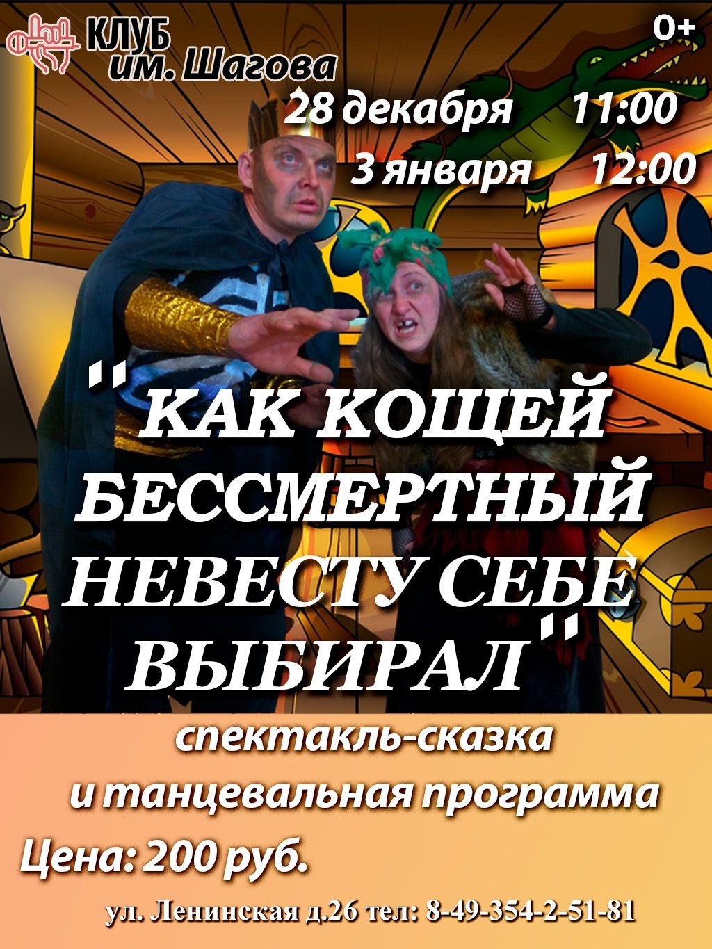 4 января клуб имени Шагова городского округа Вичуга приглашает жителей и гостей города на спектакль «Как Кощей Бессмертный невесту себе выбирал». Сказочные герои увлекут юных зрителей в волшебный мир сказки. Завораживающий сюжет будет интересен не только детям, но и взрослым. Праздник продолжится возле елки, где ребята вместе с главными героями будут водить хороводы, танцевать, играть в игры и петь песни.
